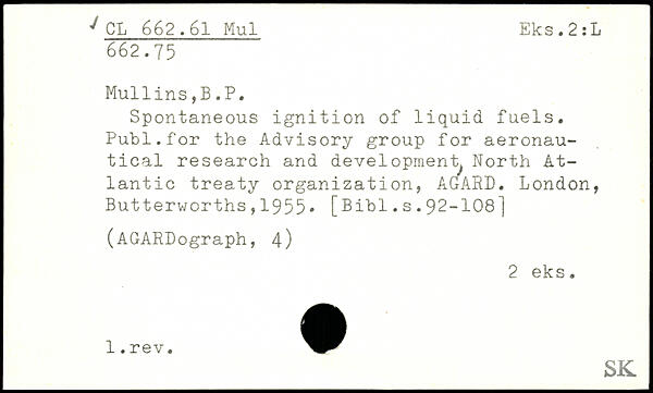 Spontaneous ignition of liquid fuels. Publ.for the Advisory group for aeronautical research and development. North Atlantic treaty organization, AGARD.