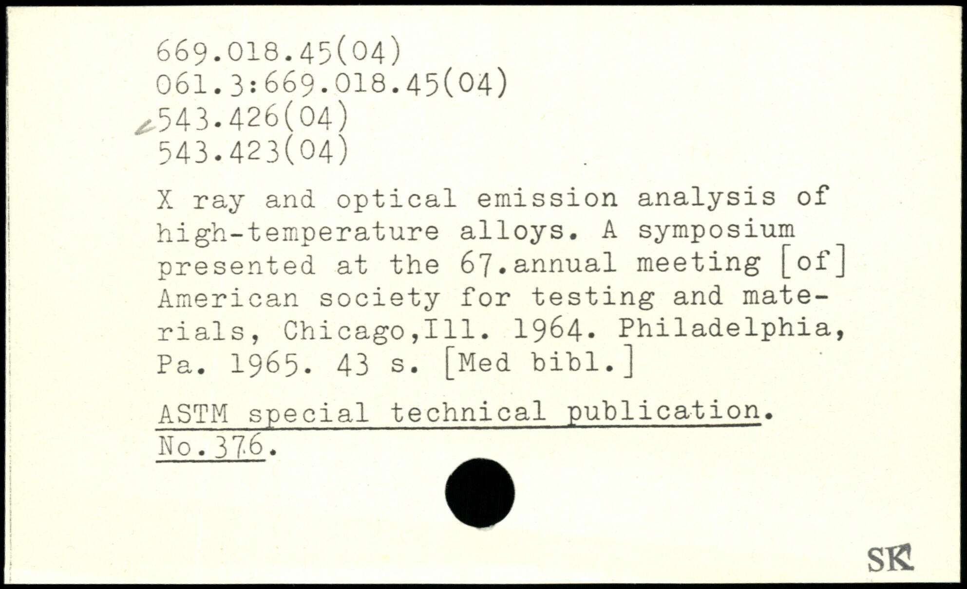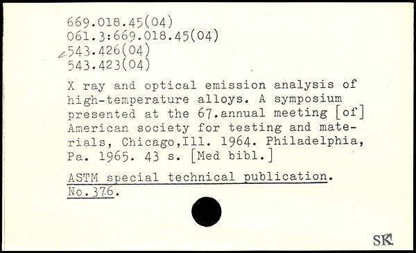 X ray and optical emission analysis of high-temperature alloys. A symposium presented at the 67,annual meeting [of] American society for testing and materials, Chicago,111. 1964. Philadelphia, Pa. 1965.