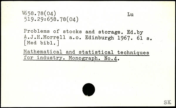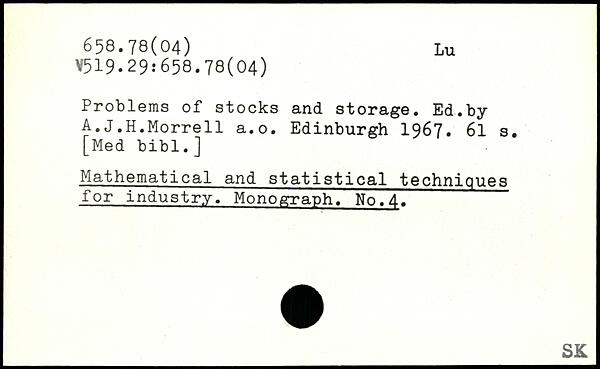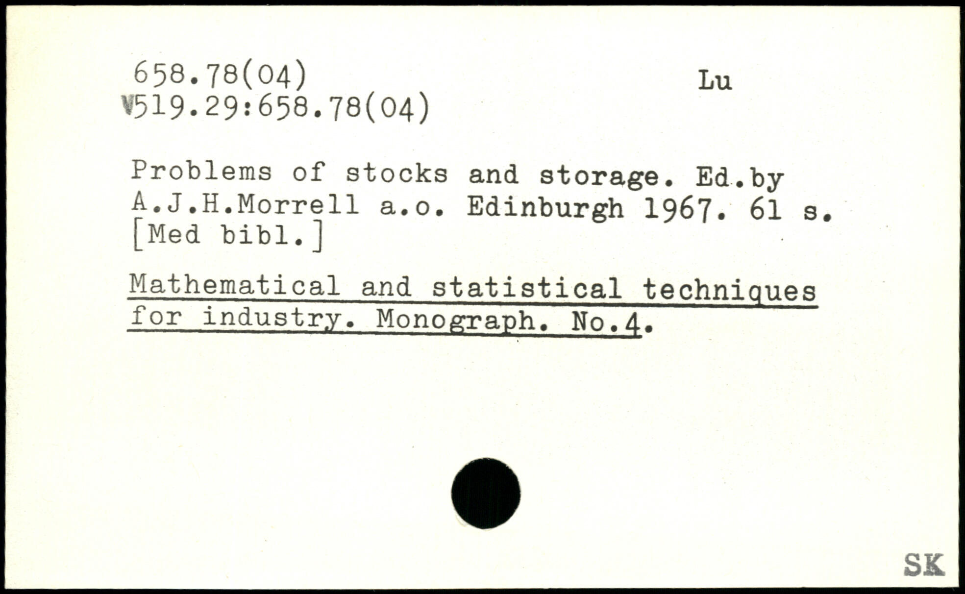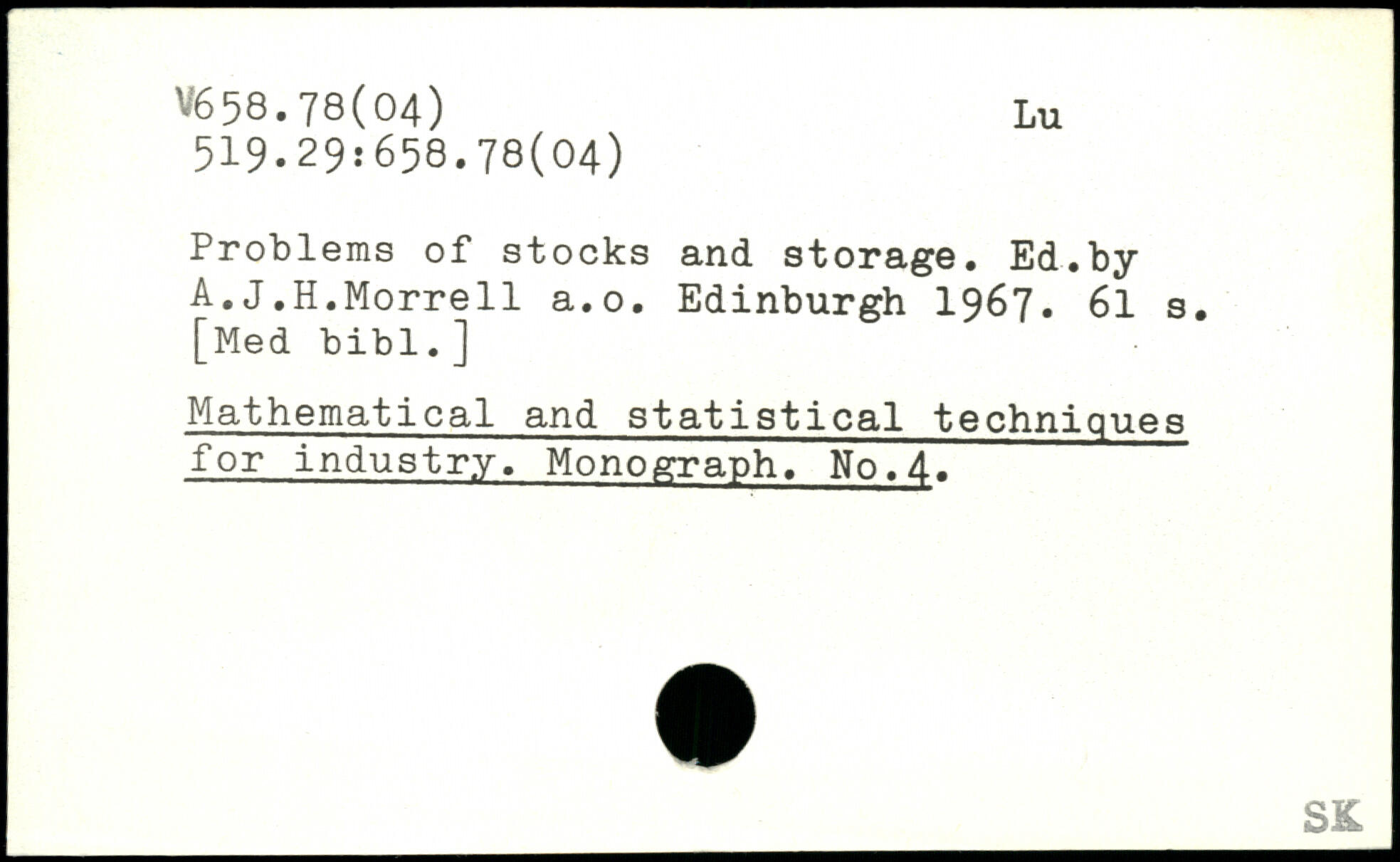 Problems of stocks and storage. Ed.by A.J.H.Morrell a.o. Edinburgh 1967. 6l s. [Med bibl.] Mathematical and statistical techniques for industry. Monograph. No. 4.