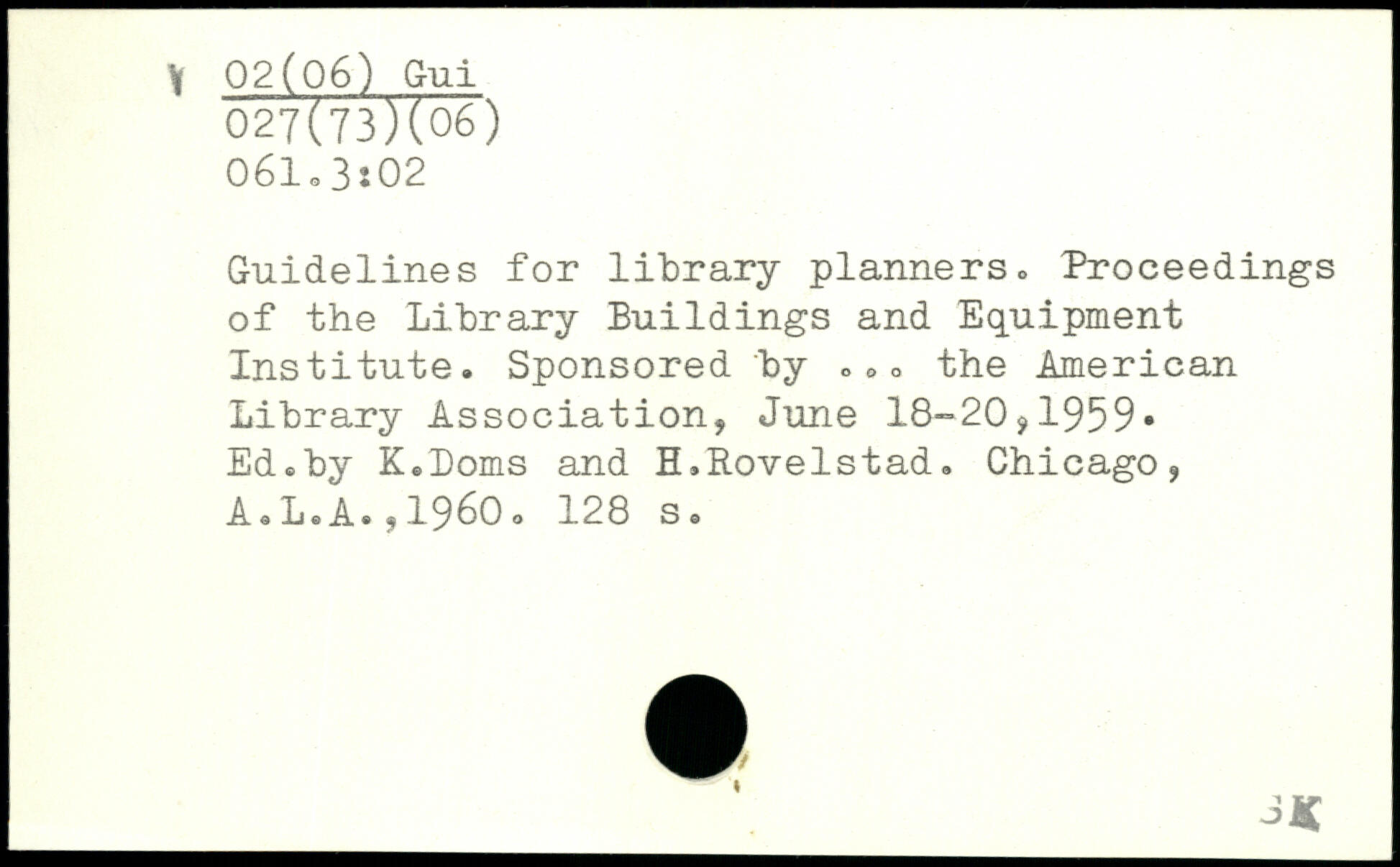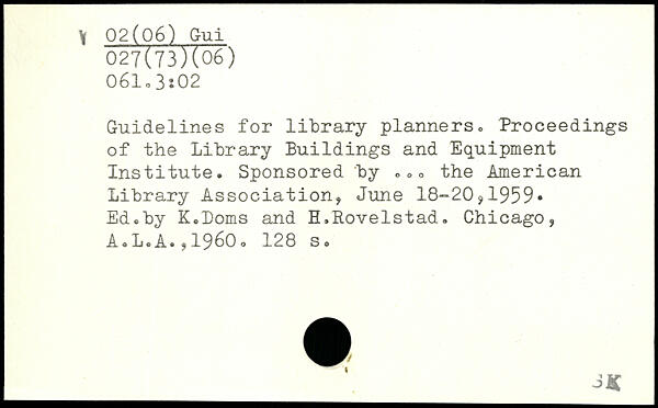 Guidelines for library planners. Proceedings of the Library Buildings and Equipment Institute. Sponsored by o0, the American Library Association, June 18-20,1959, Ed.by K.Doms and H.Rovelstad.