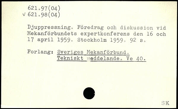 Djuppressning. Föredrag och diskussion vid MekanfÖrbundets expertkonferens den 16 och 17 april 1959.