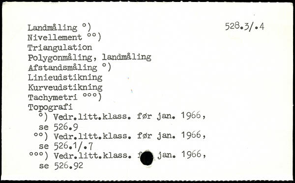Nivellement ..) Triangulation Polygonmåling, landmåling Afstandsmåling .) Linieudstikning Kurveudstikning v Tachymetri ...) Topografi .) Vedr.litt.klass. før jan. 1966, se 526.9 00) Vedr.litt.klass, før jan. 1966, se 526.1/.7 ...) Vedr.litt.klass. jan. 1966, se 526.92 W