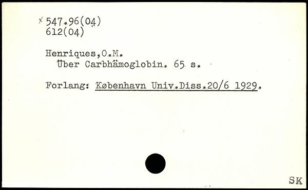 Über Carbhämoglobin. 65- s. Forlangt København Univ,Diss,20/6 1929. ,_SK