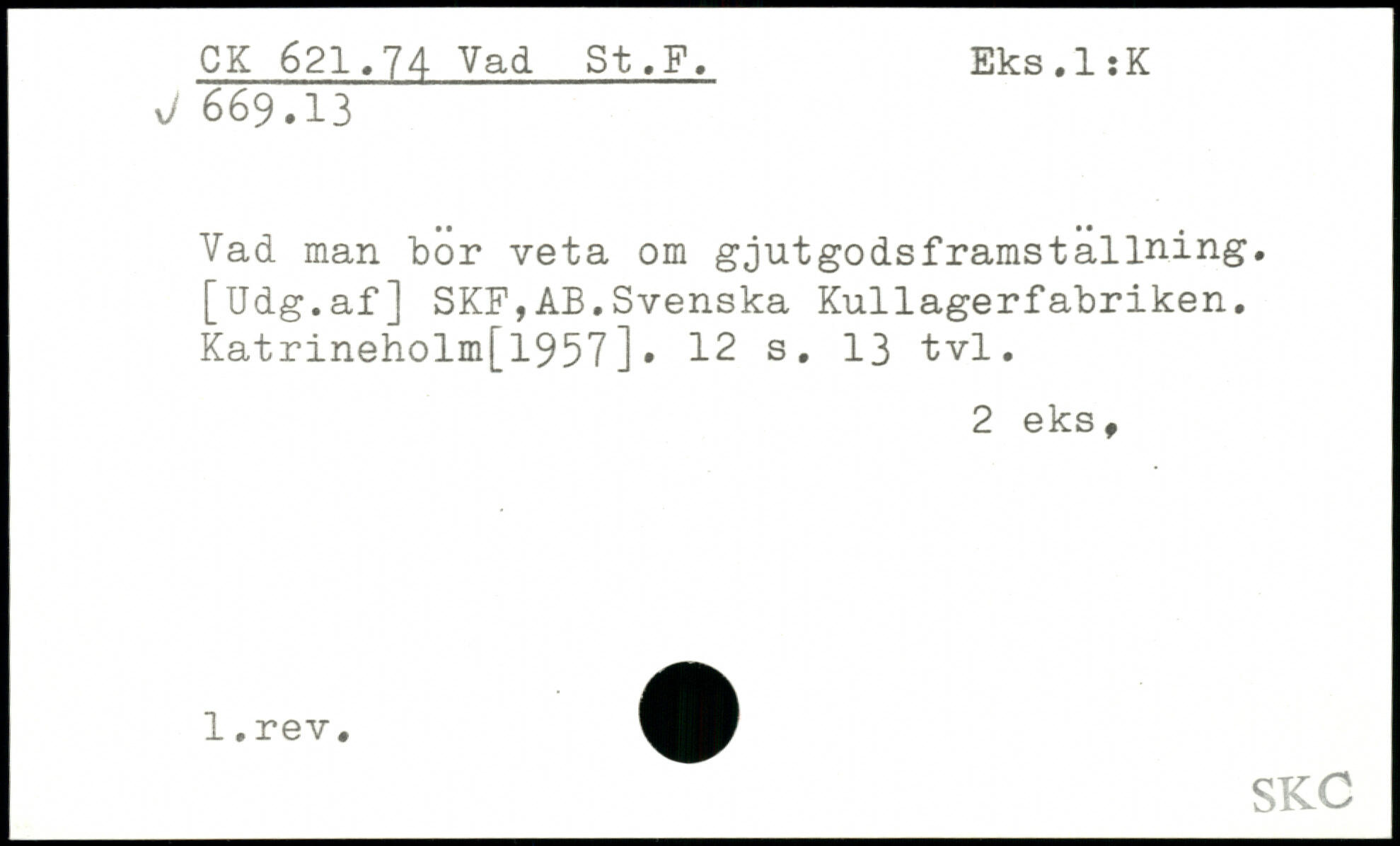 Vad man bor veta om gjutgodsframstallning. [Udg.af] SKF,AB.Svenska Kullagerfabriken. Katrineholm[1957].