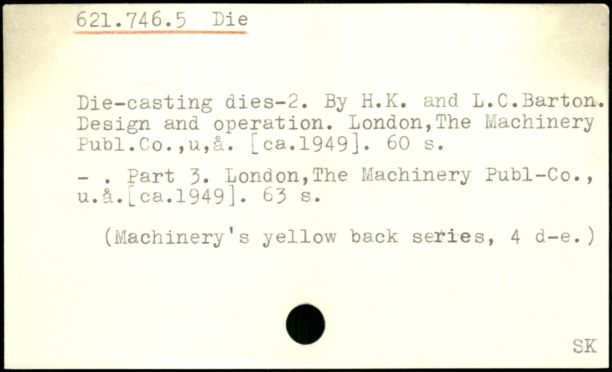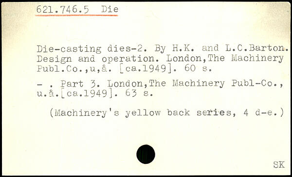 Die-casting dies-2. By H.K. and L.C.Barton. Design and operation. London,The Machinery Publ.Co.,u,&. [_ ca.1949].