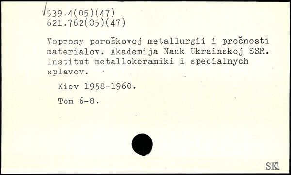 Voprosy poroskovoj metallurgii i procnosti materialov. Akademija Nauk Ukrainskoj SSR. Institut metallokeramiki i specialnych splavov. Kiev 1958-1960. Tom 6-8.