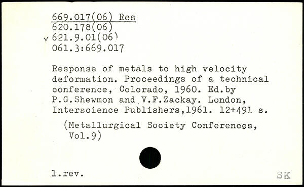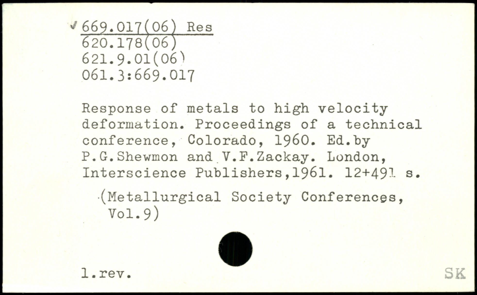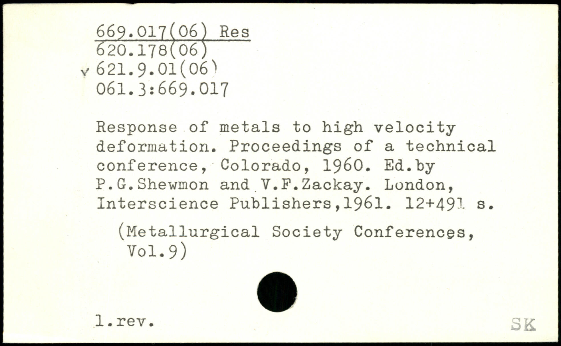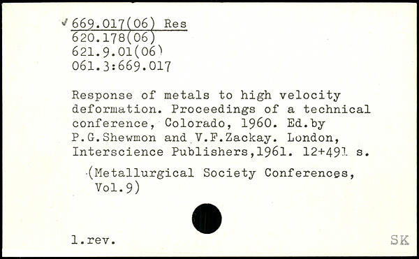 Response of metals to high velocity deformation. Proceedings of a technical conference, Colorado, 1960. Ed.by P.G.Shewmon and.V.F.Zackay.