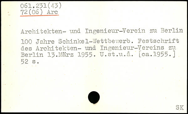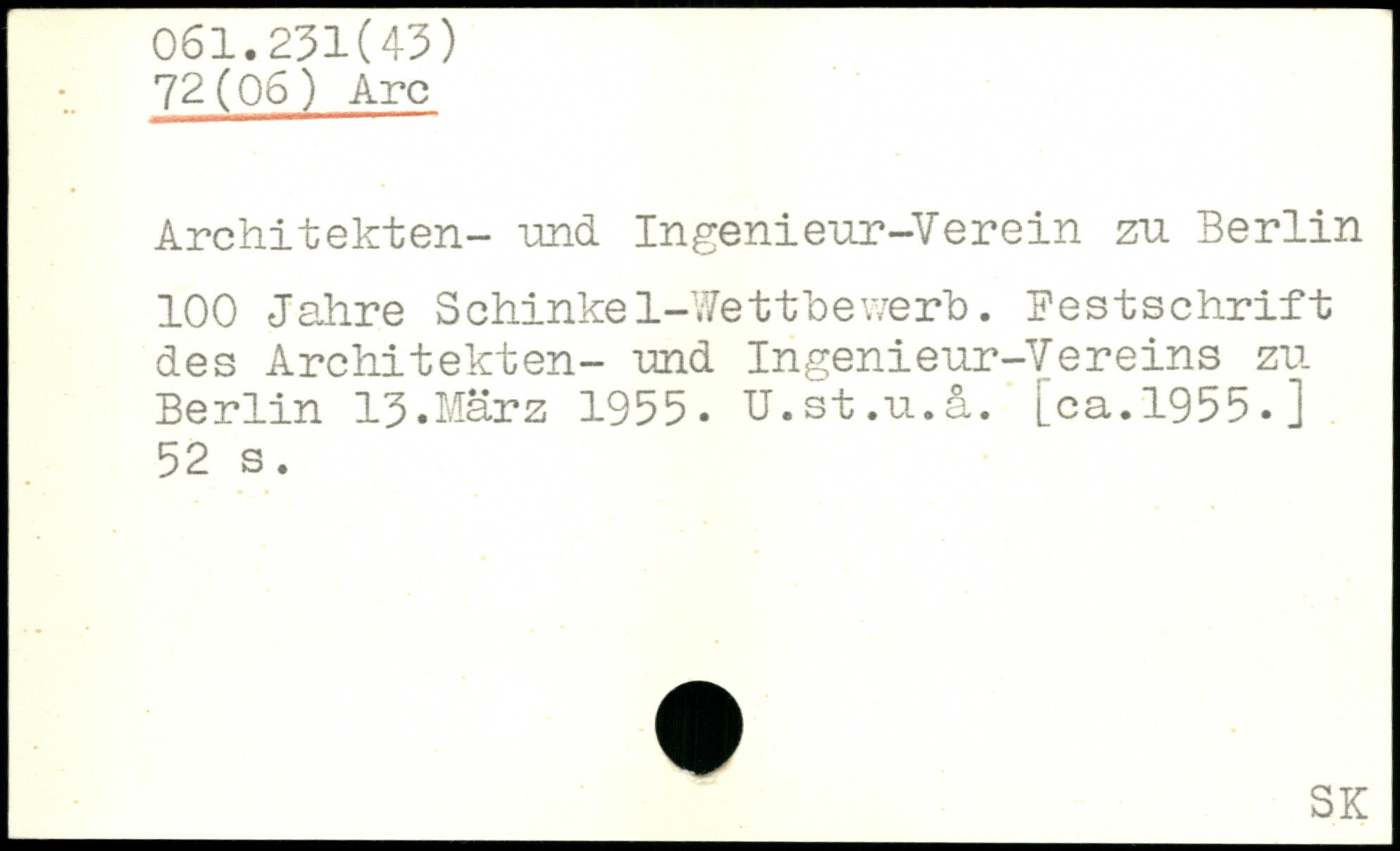 Architekten- ^md Ingenieur-Verein zu Berlin 100 Jahre Schinkel-Wettbewerb. Festschrift des Architekten- und Ingenieur-Vereins zu Berlin 13.März 1955. U.st.u.ä. [ca.1955.]