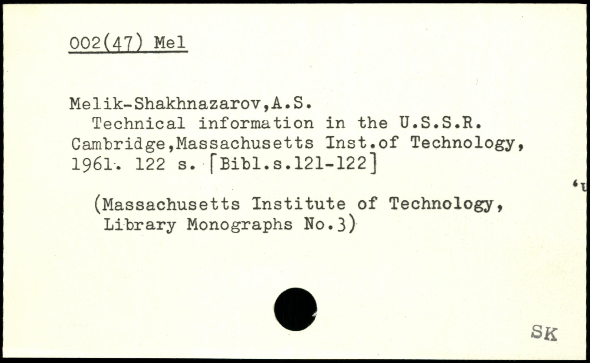 Melik-Shakhnaz arov,A.S. Technical information in the U.S.S.R. Cambridge,Massachusetts Inst.of Technology, 1961.