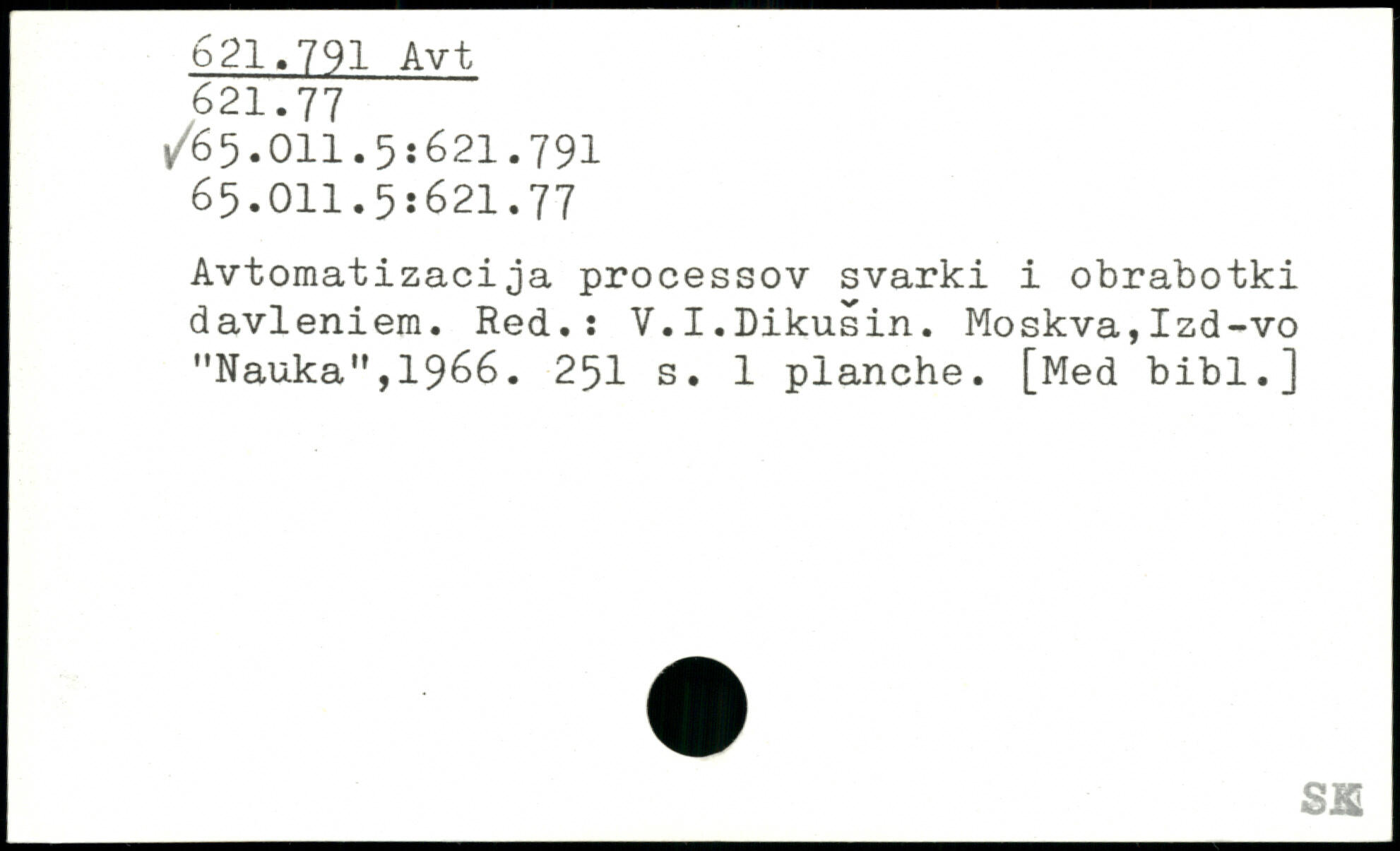 Avtoraatizacija processov svarki i obrabotki davleniem. Red.: V.I.Dikusin. Moskva,Izd-vo "Nauka",1966. 25I s. 1 planche. [Med bibl.]