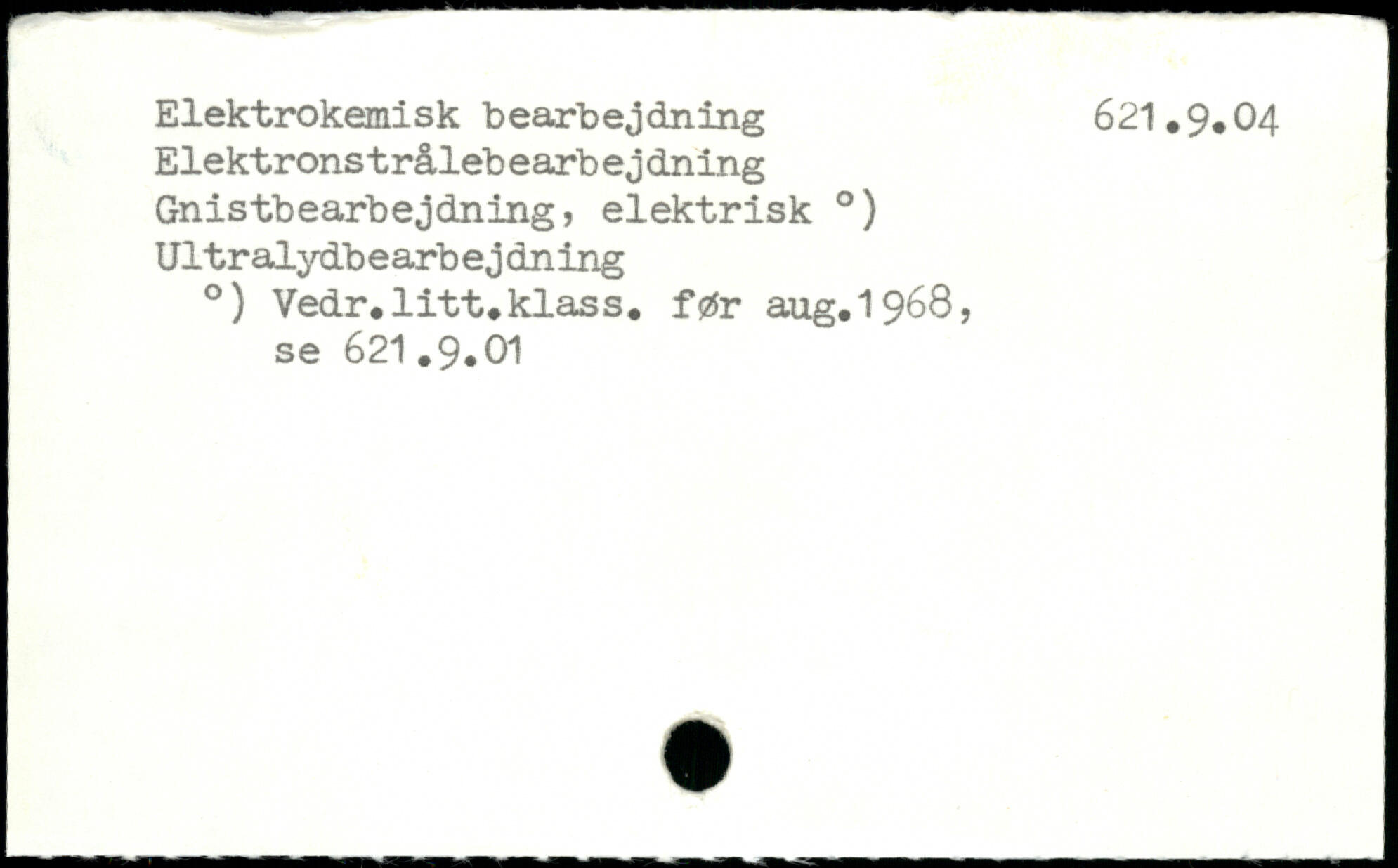 Elektrokemisk bearbejdning 621.9.04 Elektronstrålebearbejdning Gnistbearbejdning, elektrisk .) Ultralydbe arbej dning .) Vedr.litt.klass. før aug.1968, se 621.9.01