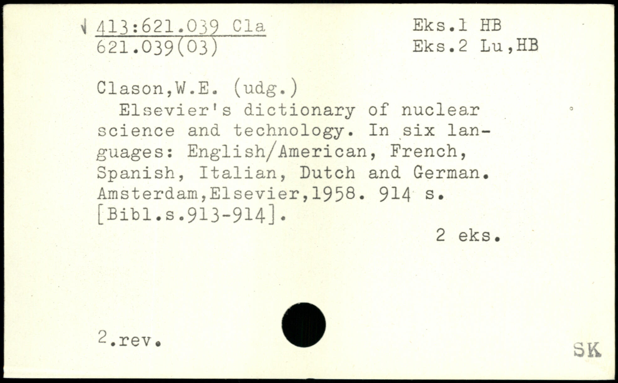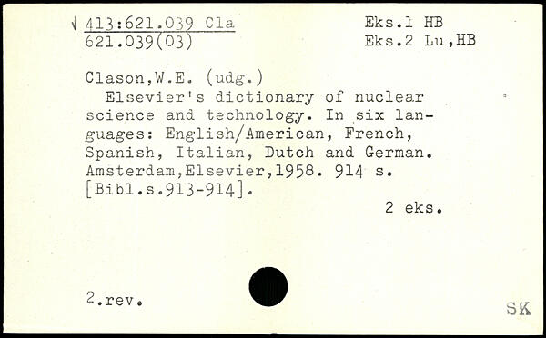 Elsevier's dictionary of nuclear science and technology. In six languages: English/American, French, Spanish, Italian, Butch and German.