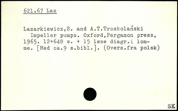 Lazarkiewicz,S. and A.T.Troskolanski Impeller pumps.