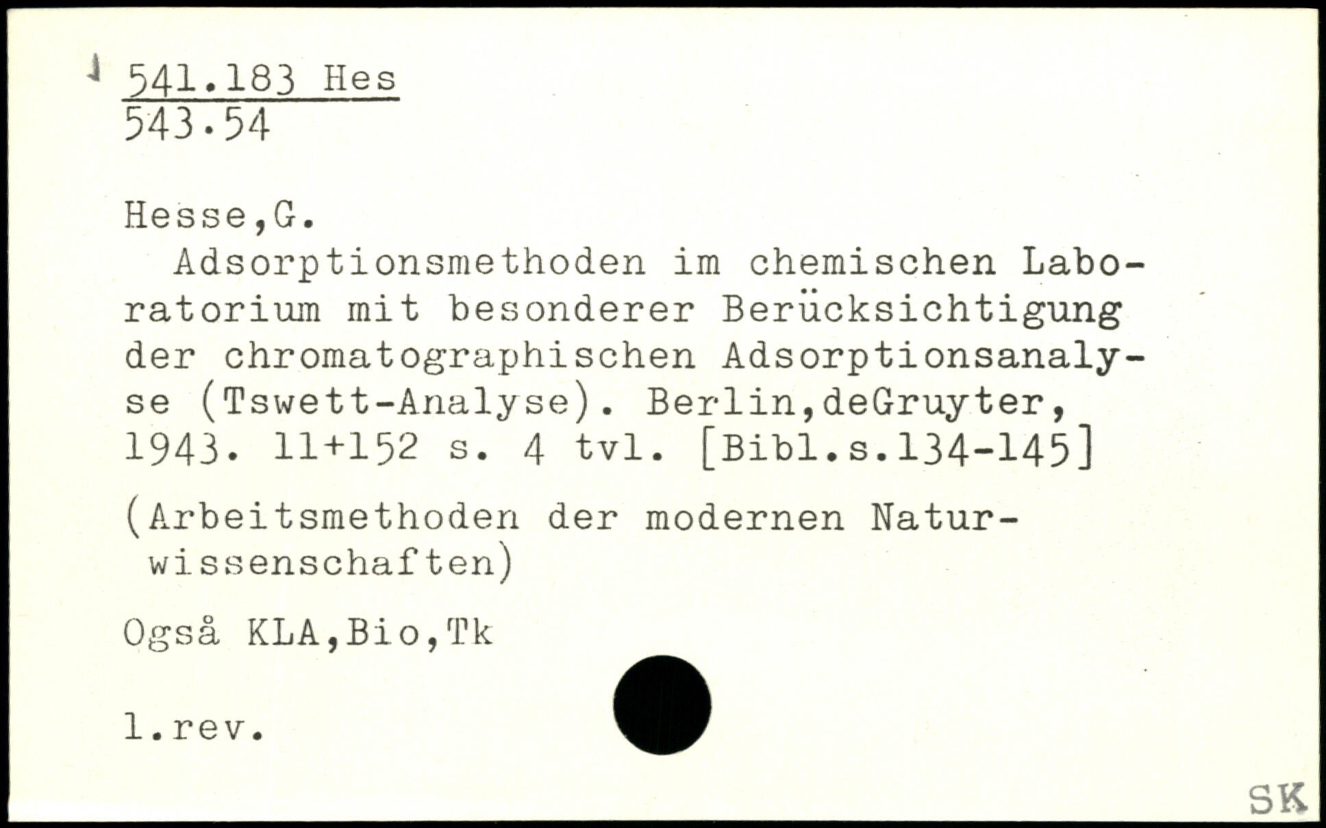 Adsorptionsmethoden im chemischen Laboratorium mit besonderer Berücksichtigung der chromatographischen Adsorptionsanalyse (Tswett-Analyse). Berlin,deGruyter, 1943. II+I
