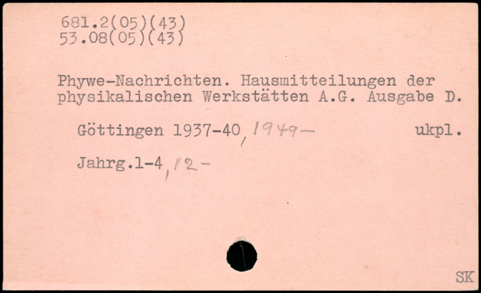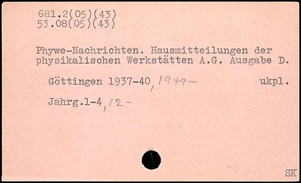 Phywe-Nachrichten. Hausmitteilungen der physikalischen Werkstätten A.G. Ausgabe D. Göttingen 1937-40^ / 7 7-?— ukpl. Jahrg.1-4