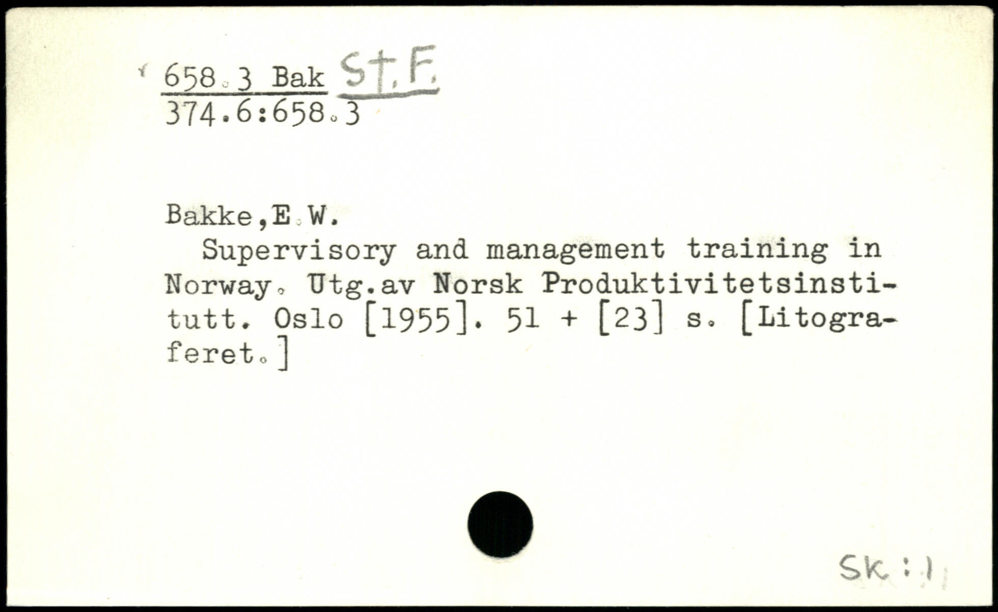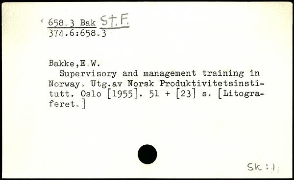 Bakke,E W. Supervisory and management training in Norway, TJtg.av Norsk Produktivitetsinstitutt. Oslo [1955]. 51 + [23] s. [Litograferet o ] Sk,: )