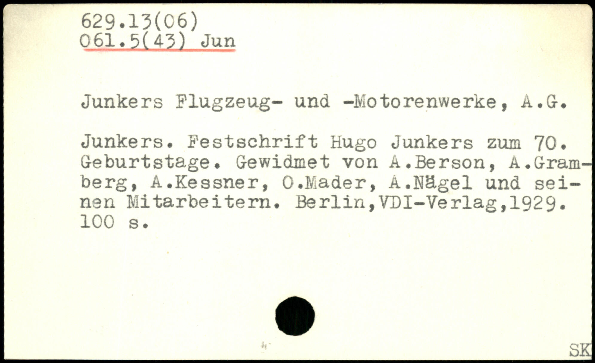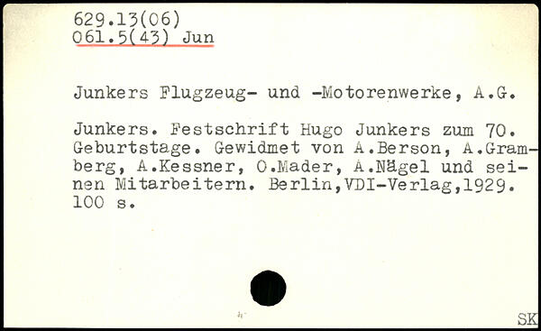 Junkers Plugzeug- und -Motorenwerke, A.G-. Junkers. Pestschrift Hugo Junkers zum 70. Geburtstage. Gewidmet von A.Berson, A.Gramberg, A.Kessner, 0.Mader, A.Nägel und seinen Mitarbeitern.