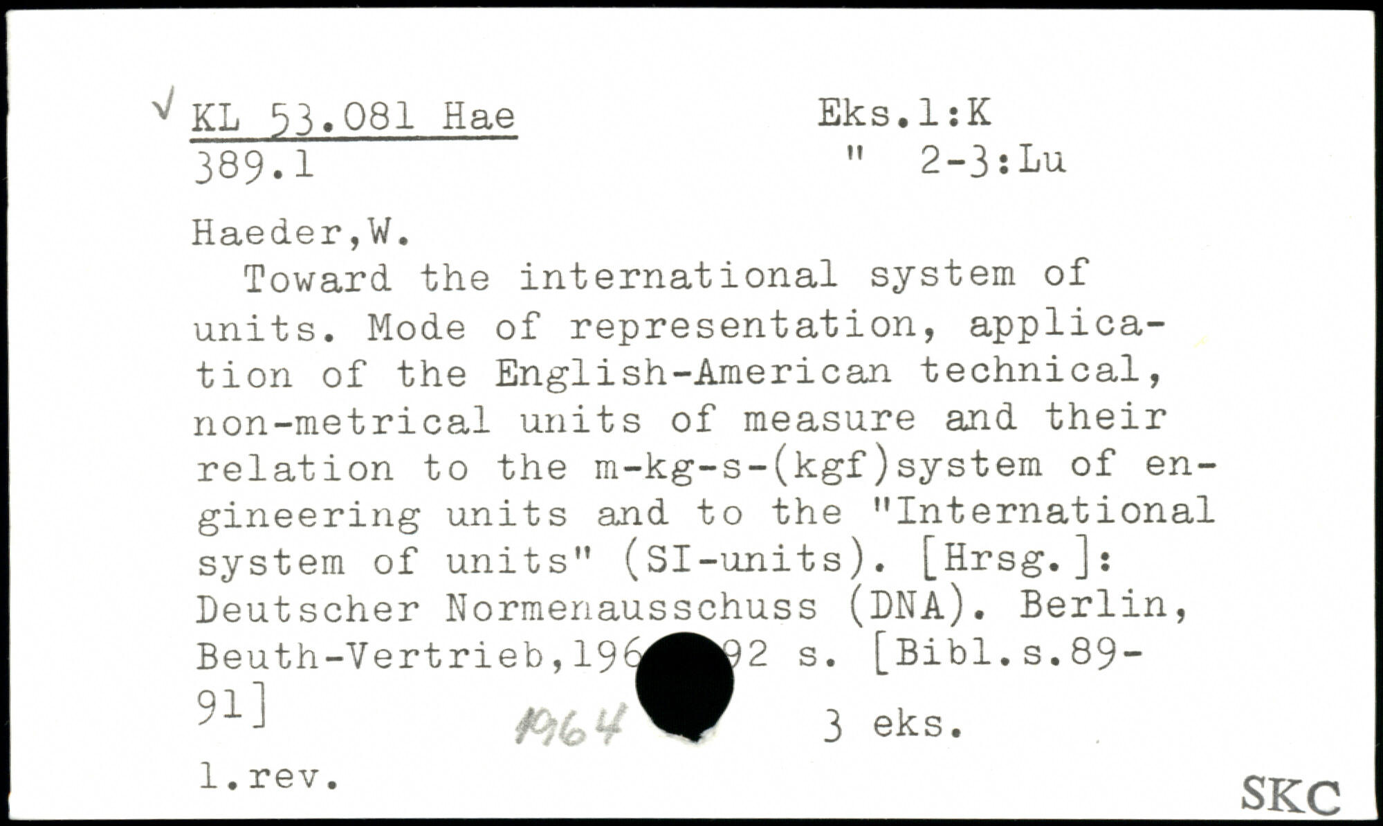 Toward the international system of units. Mode of representation, application of the English-American technical, non-metrical units of measure and their relation to the m-kg-s-(kgf)system of engineering units and to the "International system of units" (Si-units). [Hrsg.]: Deutscher Normenausschuss (DNA). Berlin, Beuth-Vertrieb,s.