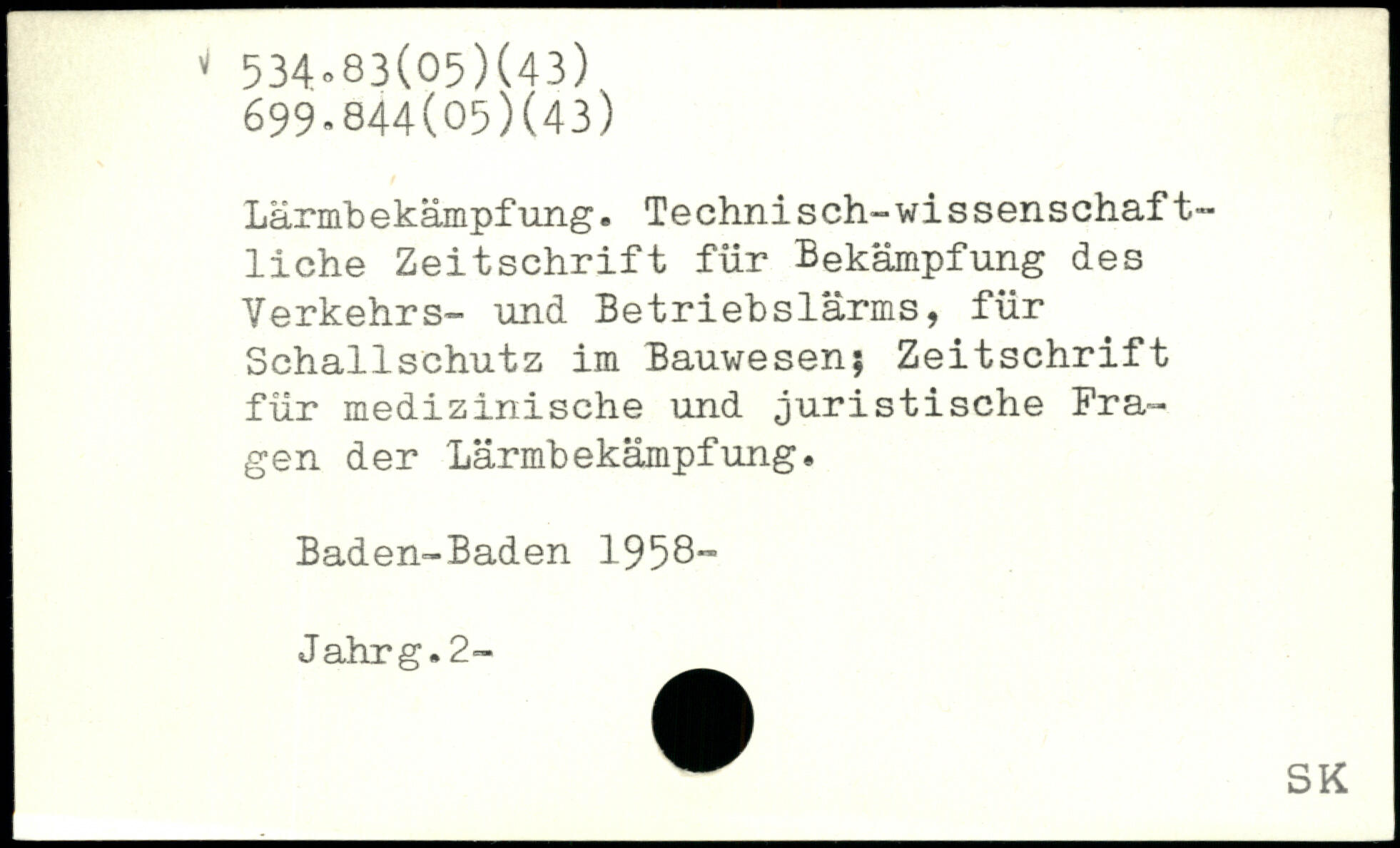 Lärmbekämpfung. Technisch-wissenschaftliche Zeitschrift für Bekämpfung des Verkehrs- und Betriebslärms, für Schallschutz im Bauwesen; Zeitschrift für medizinische und juristische Fragen der Lärmbekämpfung. Baden-Baden 1958” Jahrg.2-