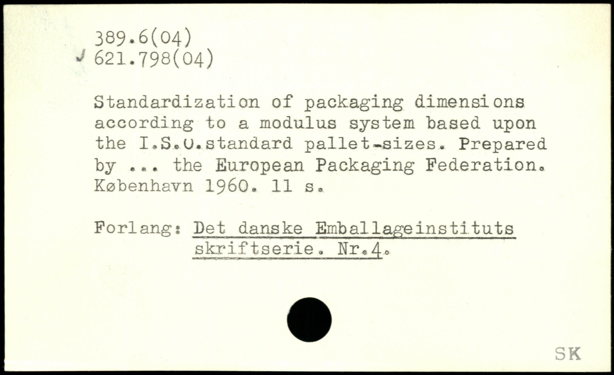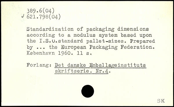 Standardization of packaging dimensions according to a modulus system based upon the I.S.U.standard pallet-sizes. Prepared by ... the European Packaging Federation.