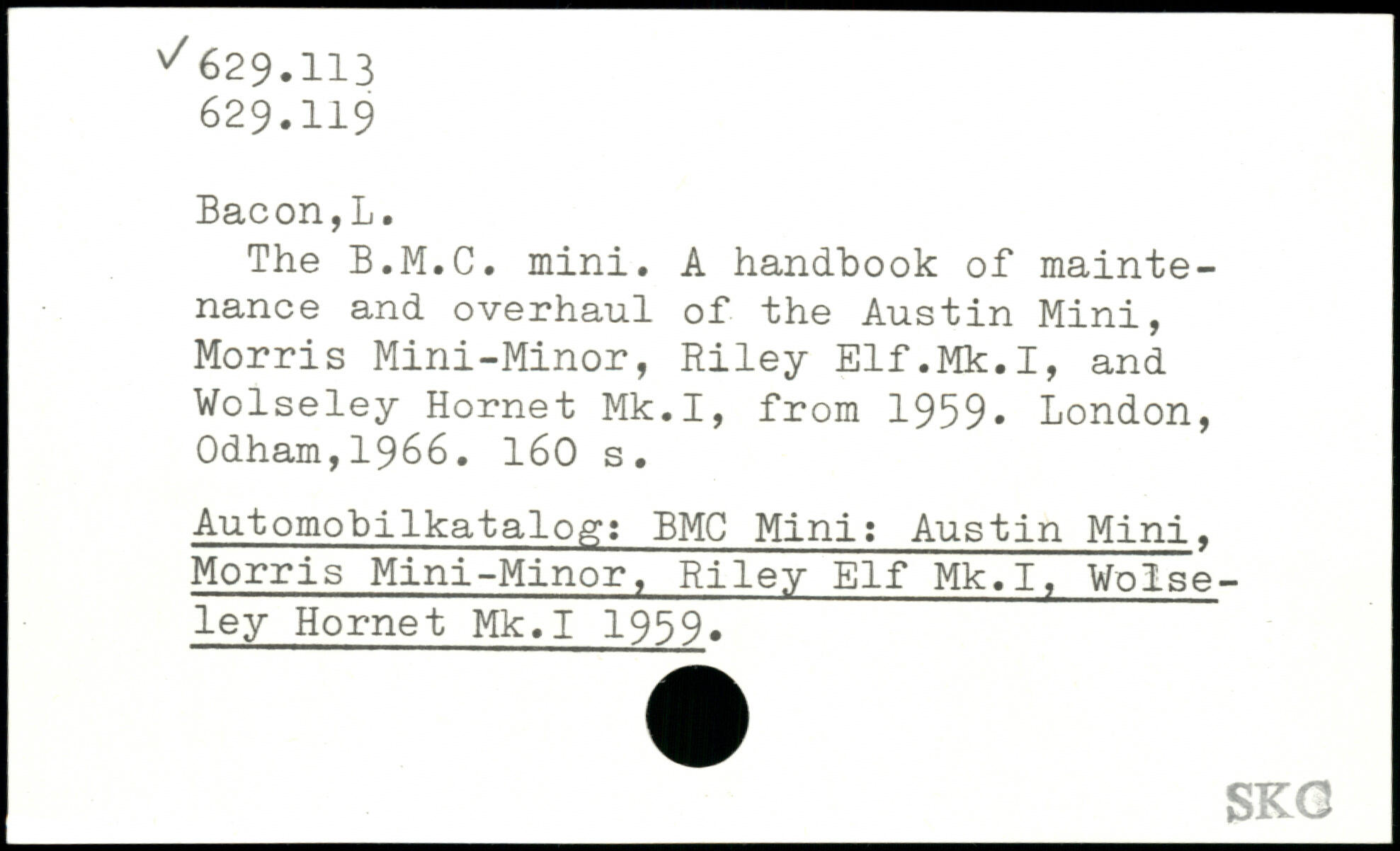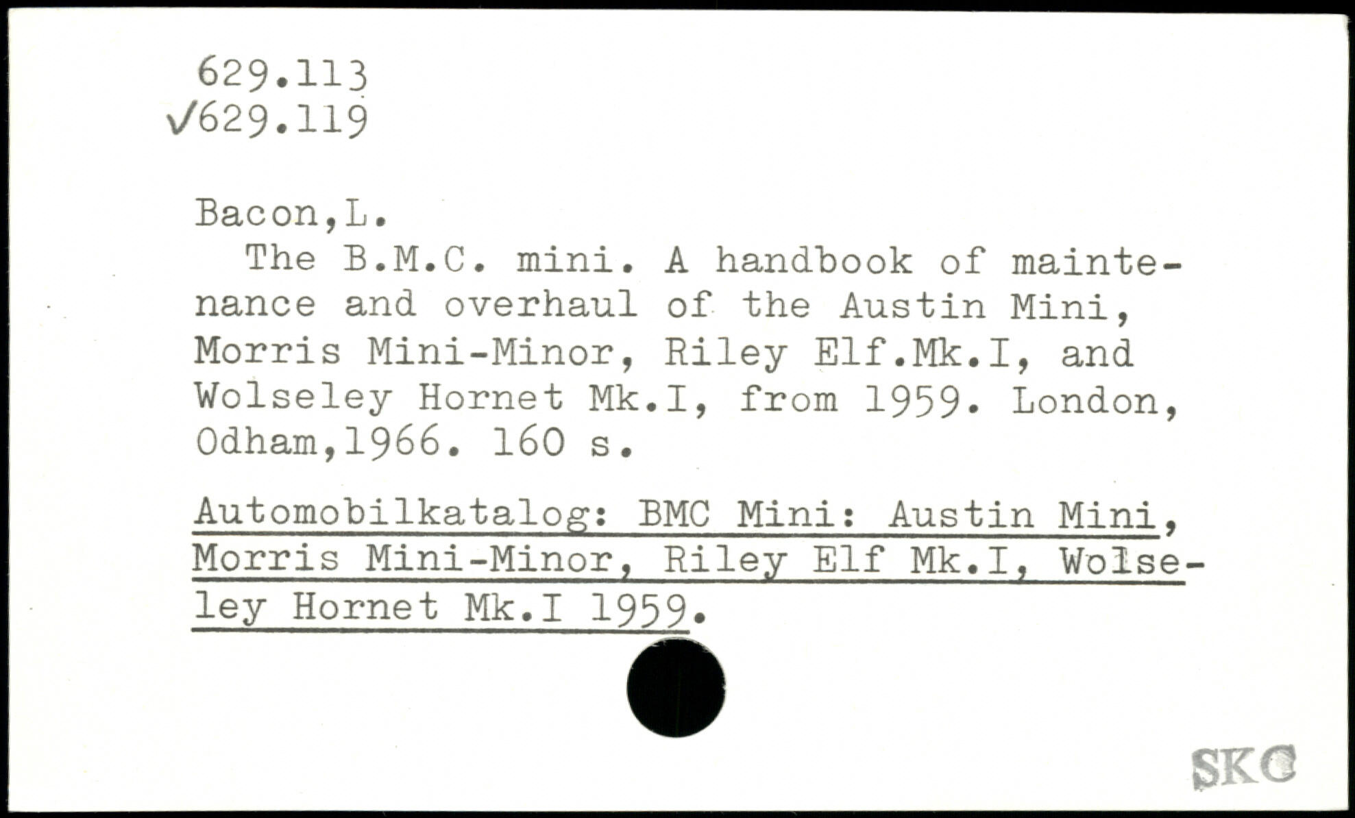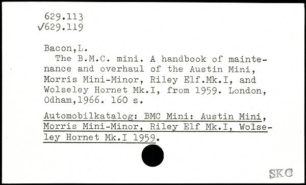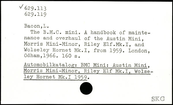 The B.M.C. mini. A handbook of maintenance and overhaul of the Austin Mini, Morris Mini-Minor, Riley Elf.Mk.I, and Wolseley Hornet Mk.I, from 1959.