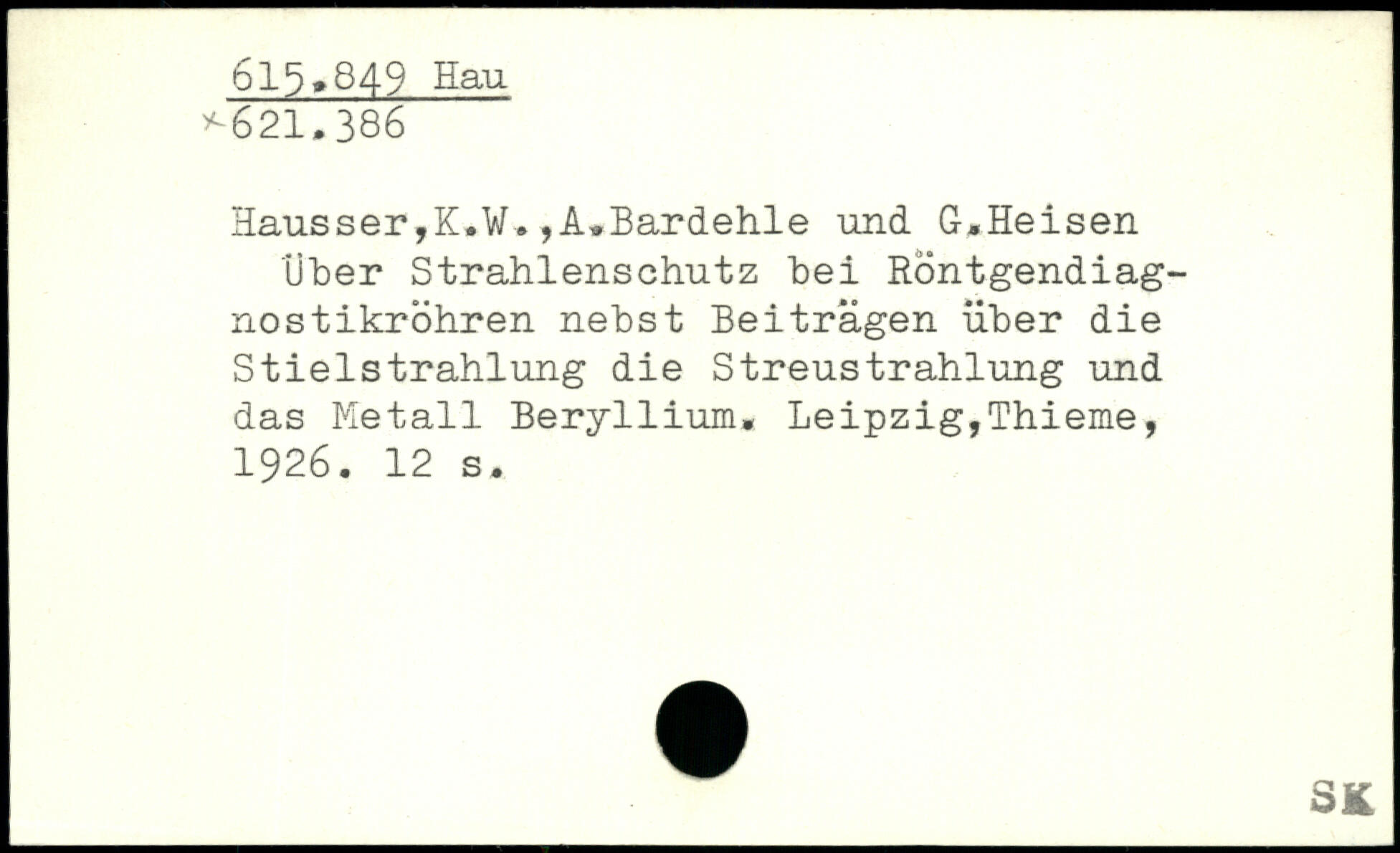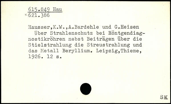 Hausser,K.W. ,A.Bardehle und G.Heisen Über Strahlenschutz bei Röntgendiagnostikröhren nebst Beiträgen über die StielStrahlung die Streustrahlung und das