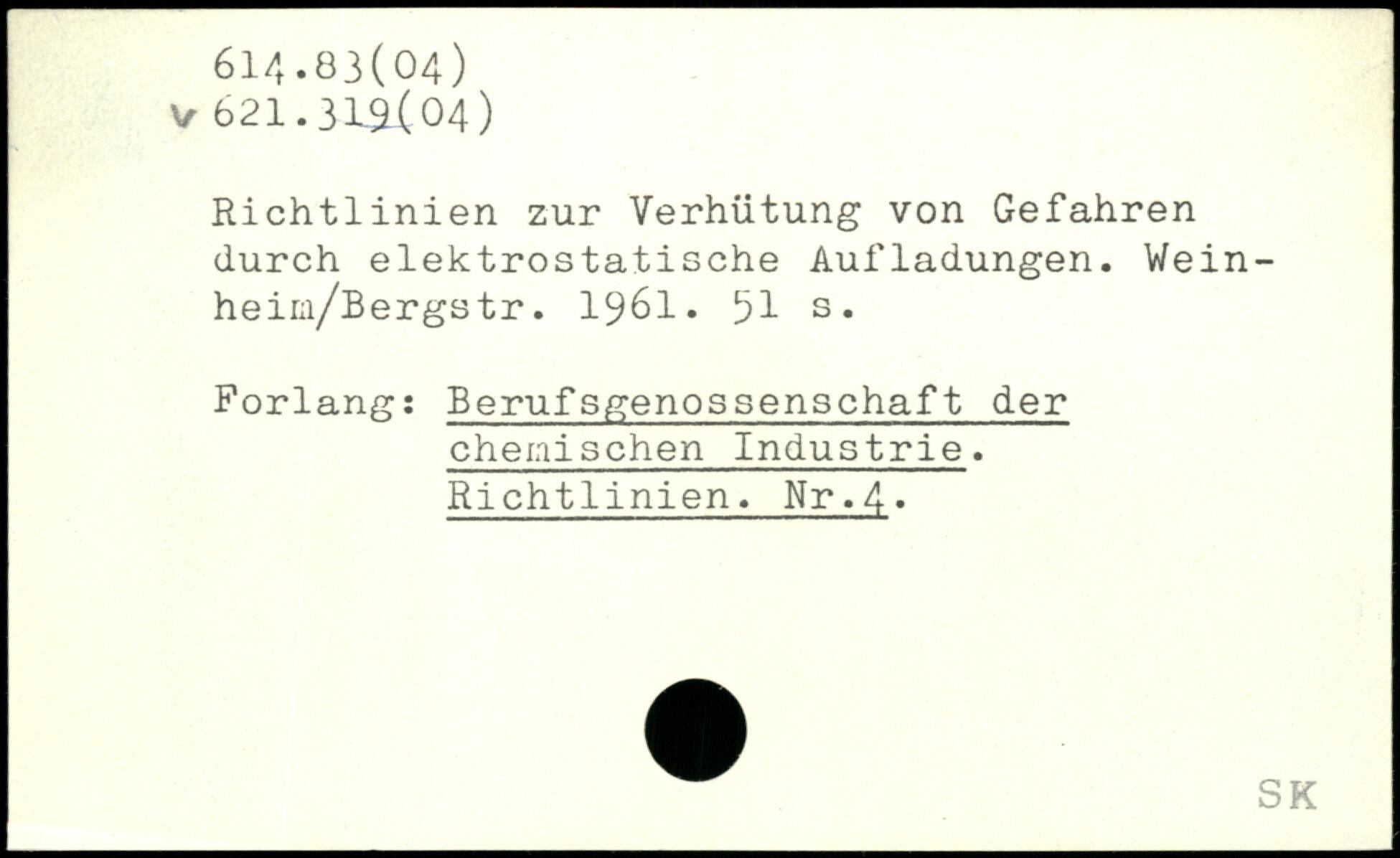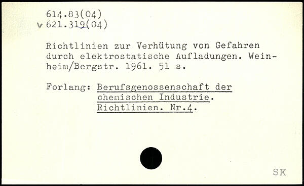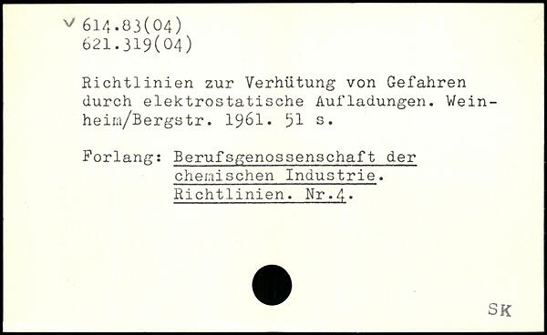 Richtlinien zur Verhütung von Gefahren durch elektrostatische Aufladungen. Wein-heim/Bergstr. 1961.
