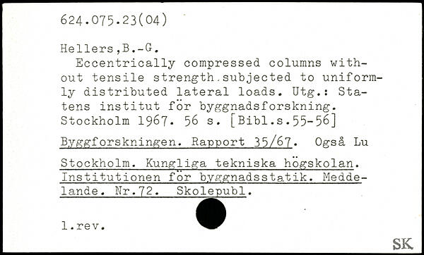 Eccentrically compressed columns without tensile strength.subjected to uniformly distributed lateral loads. Utg.: Statens institut for byggnadsforskning.