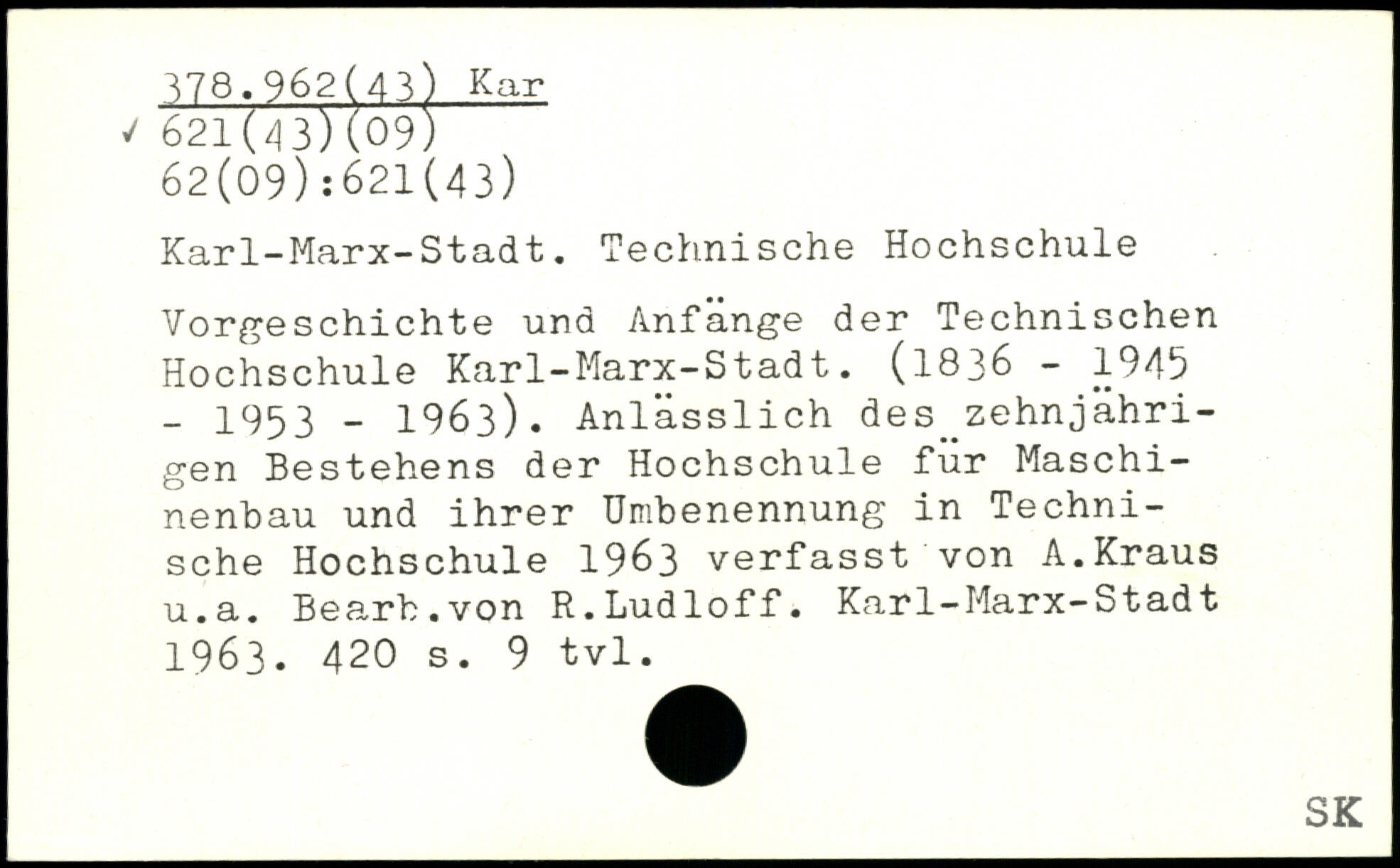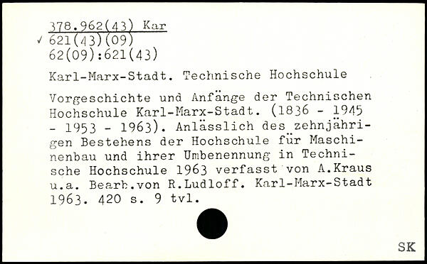 Karl-Marx-Stadt. Technische Hochschule Vorgeschichte und Anfänge der Technischen Hochschule Karl-Marx-Stadt. (1836 - 1945 - 1953 - 1963). Anlässlich des^zehnjähri-gen Bestehens der Hochschule für Maschinenbau und ihrer Umbenennung in Technische Hochschule 1963 verfasst von A.Kraus u.a. Bearb.von R.Ludloff. Karl-Marx-Stadt 1963.
