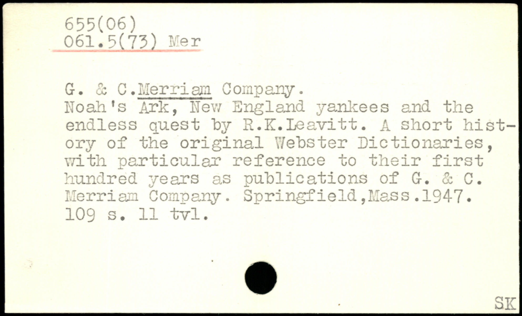 G. cc C.Uerriam Company. Noah’s Ark, New England yankees and the endless quest by R.K. Leavitt. A short history of the original Webster Dictionaries, with particular reference to their first hundred years as publications of G-. & C. Merriam Company. Springfield ,Liass. 1947.
