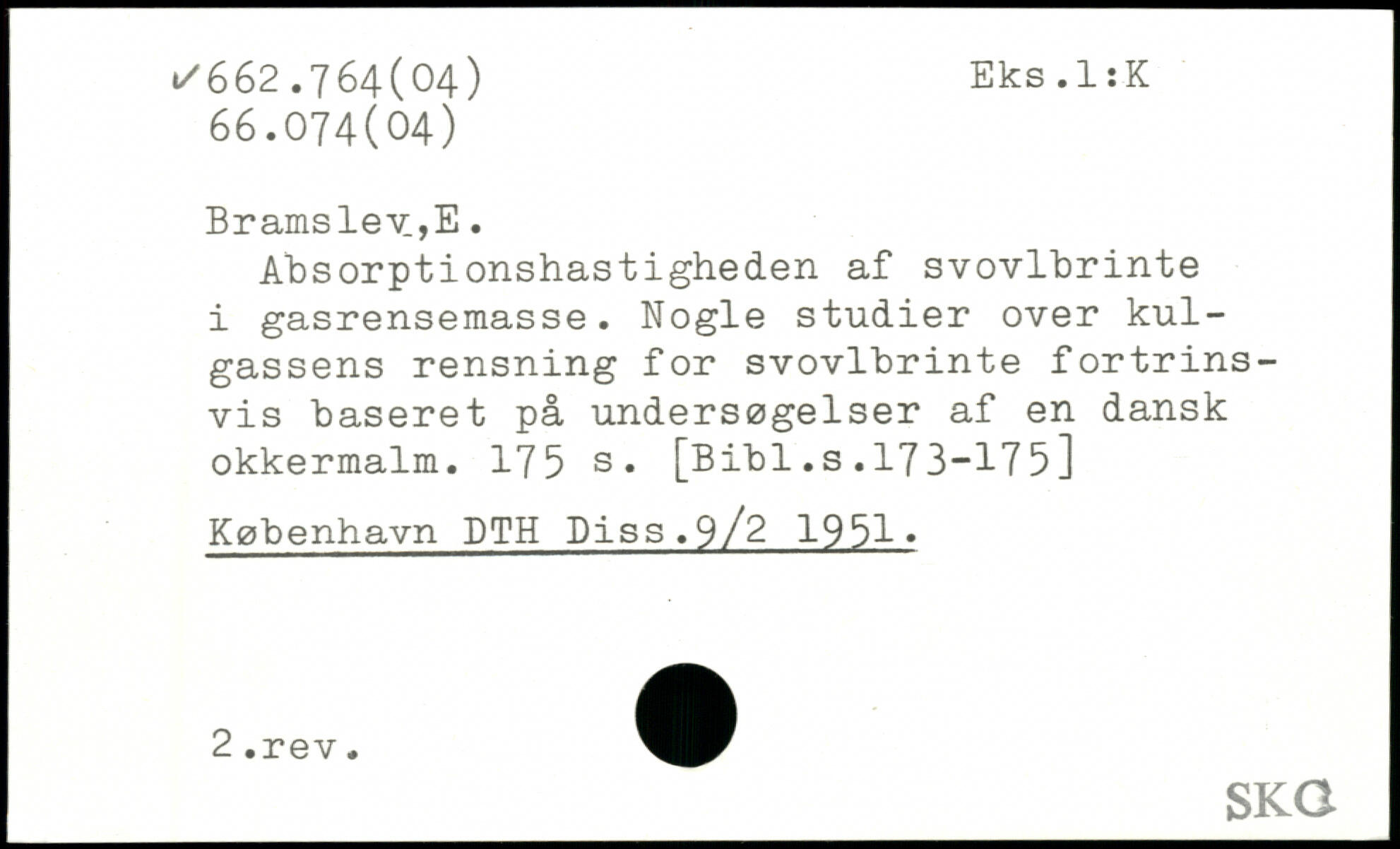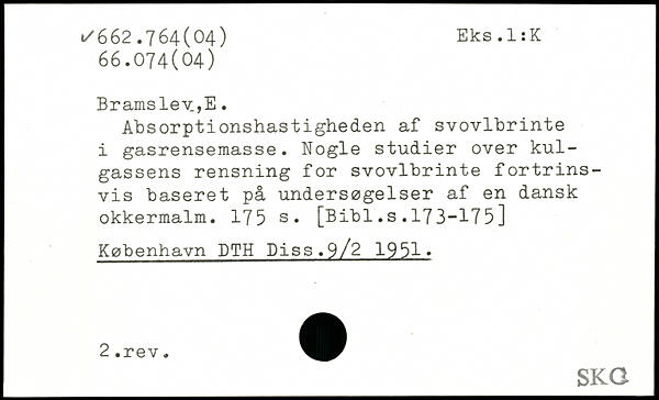 Bramslev.,E. Absorptionshastigheden af svovlbrinte i gasrenseinasse. Nogle studier over kulgassens rensning for svovlbrinte fortrinsvis baseret på undersøgelser af en dansk okkermalm.