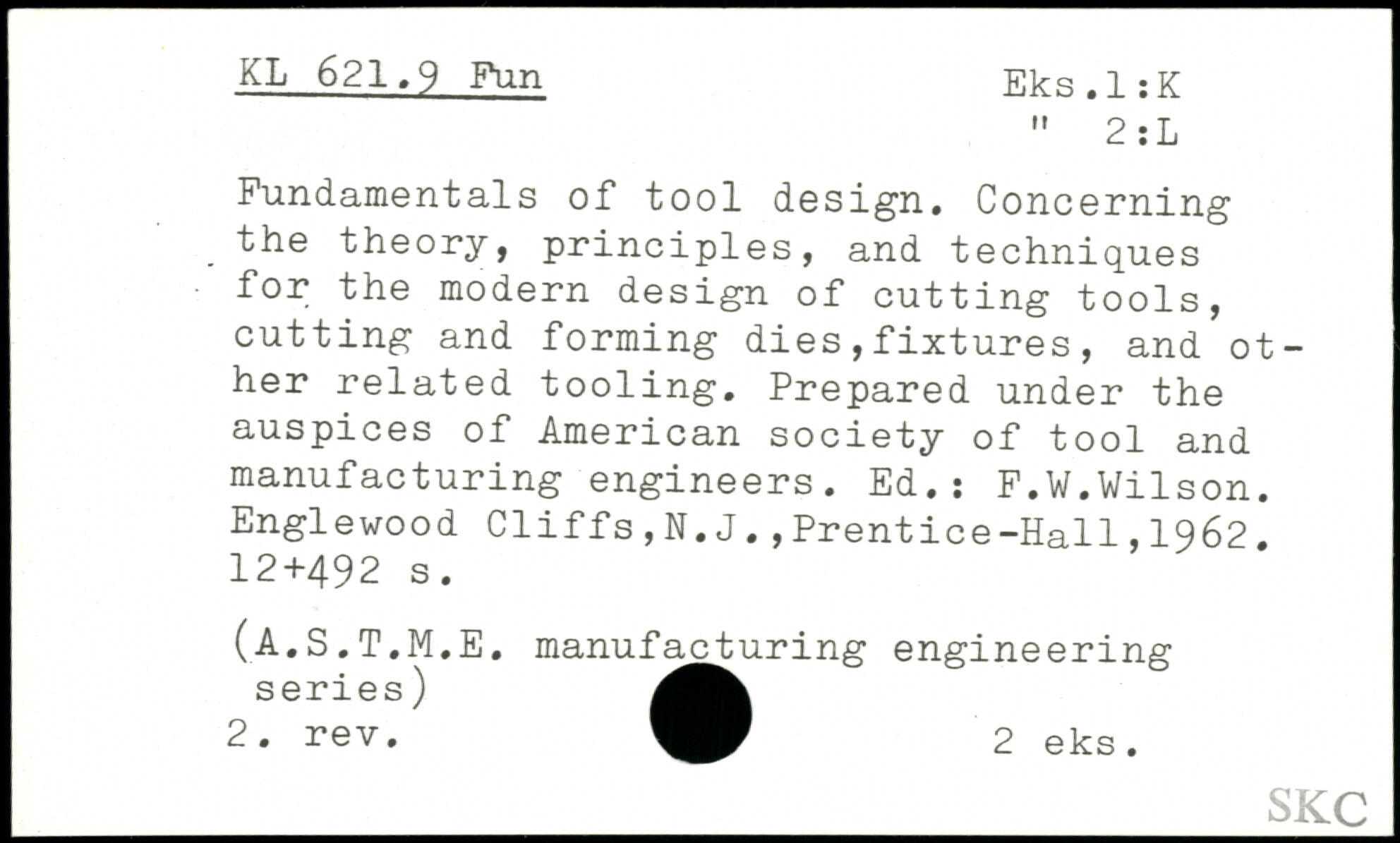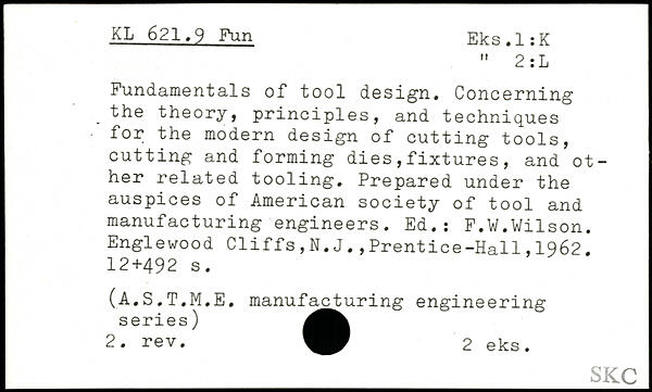 Fundamentals of tool design. Concerning. the theory, principles, and techniques for the modern design of cutting tools, cutting and forming dies,fixtures, and other related tooling. Prepared under the auspices of American society of tool and manufacturing engineers. Ed.: F.W.Wilson.