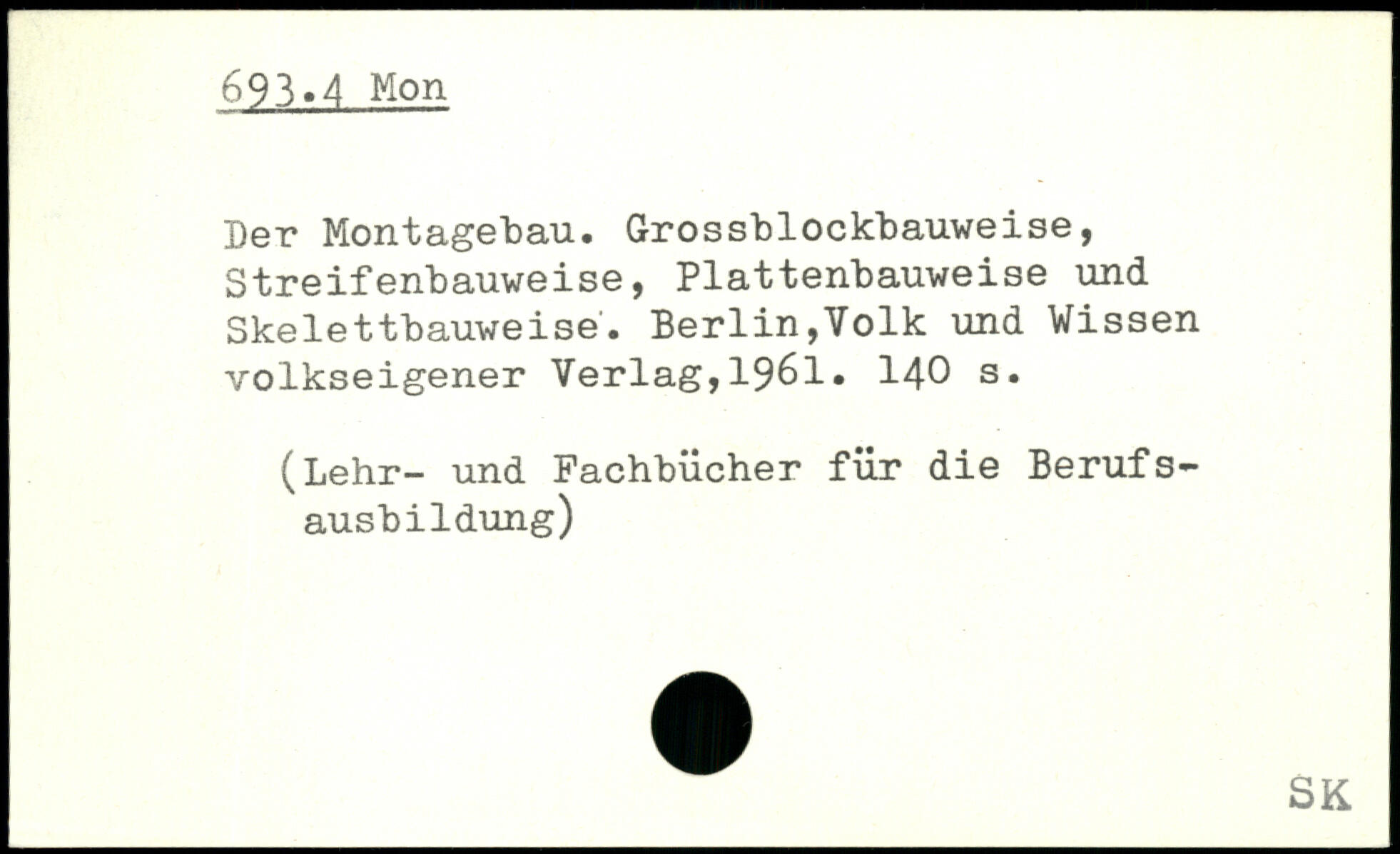 Der Montagebau. Grossblockbauweise, Streifenbauweise, Plattenbauweise und Skelettbauweise. Berlin,Volk und Wissen volkseigener Verlag,1961.