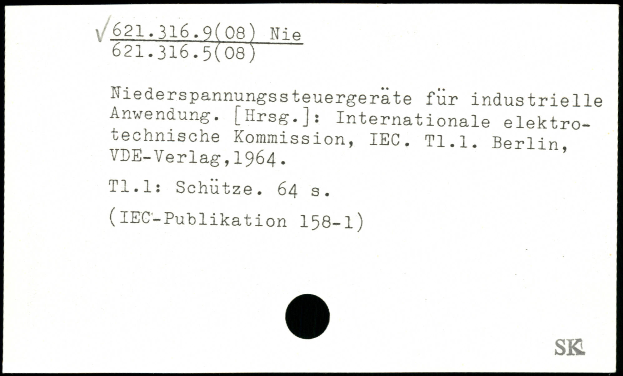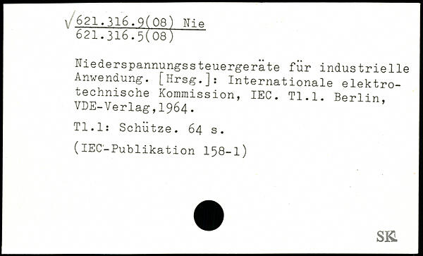 Hiederspannungssteuergerate für industrielle Anwendung. [Hrsg.]: Internationale elektrotechnische Kommission, IEC. Tl.l. Berlin VDE-Verlag,1964. Tl.l: Schütze.