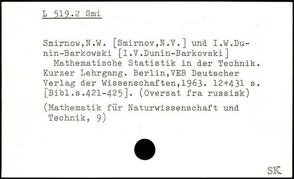 Smirnow,N.W. [Smirnov,N.V.] und I.W.Du-nin-Barkowski [i.V.Dunin-Barkovski] Mathematische Statistik in der Technik. Kurzer Lehrgang. Berlin,VEB Deutscher Verlag der Wissenschaften,1963.
