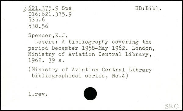 Lasers: A bibliography covering the period December 1958-May 1962. London, Ministry of Aviation Central Library, 1962.