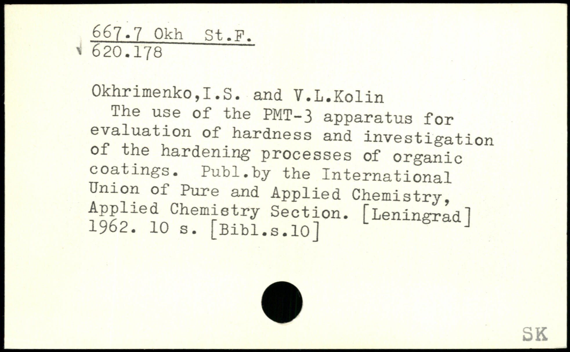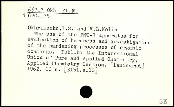 Okhrimenko,I,S. and V.L.Kolin The use of the PMT-3 apparatus for evaluation of hardness and investigation of the hardening processes of organic coatings.