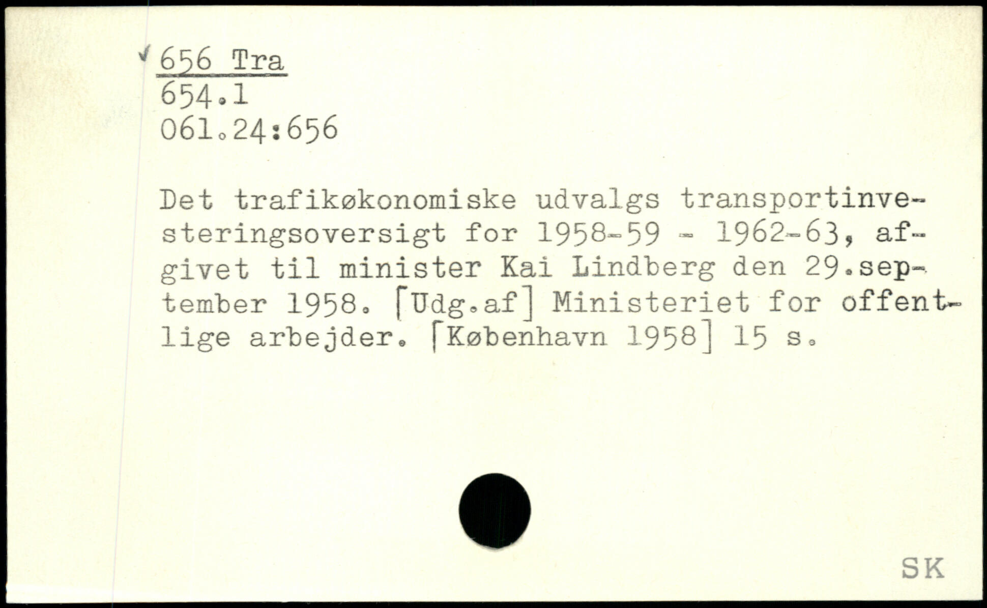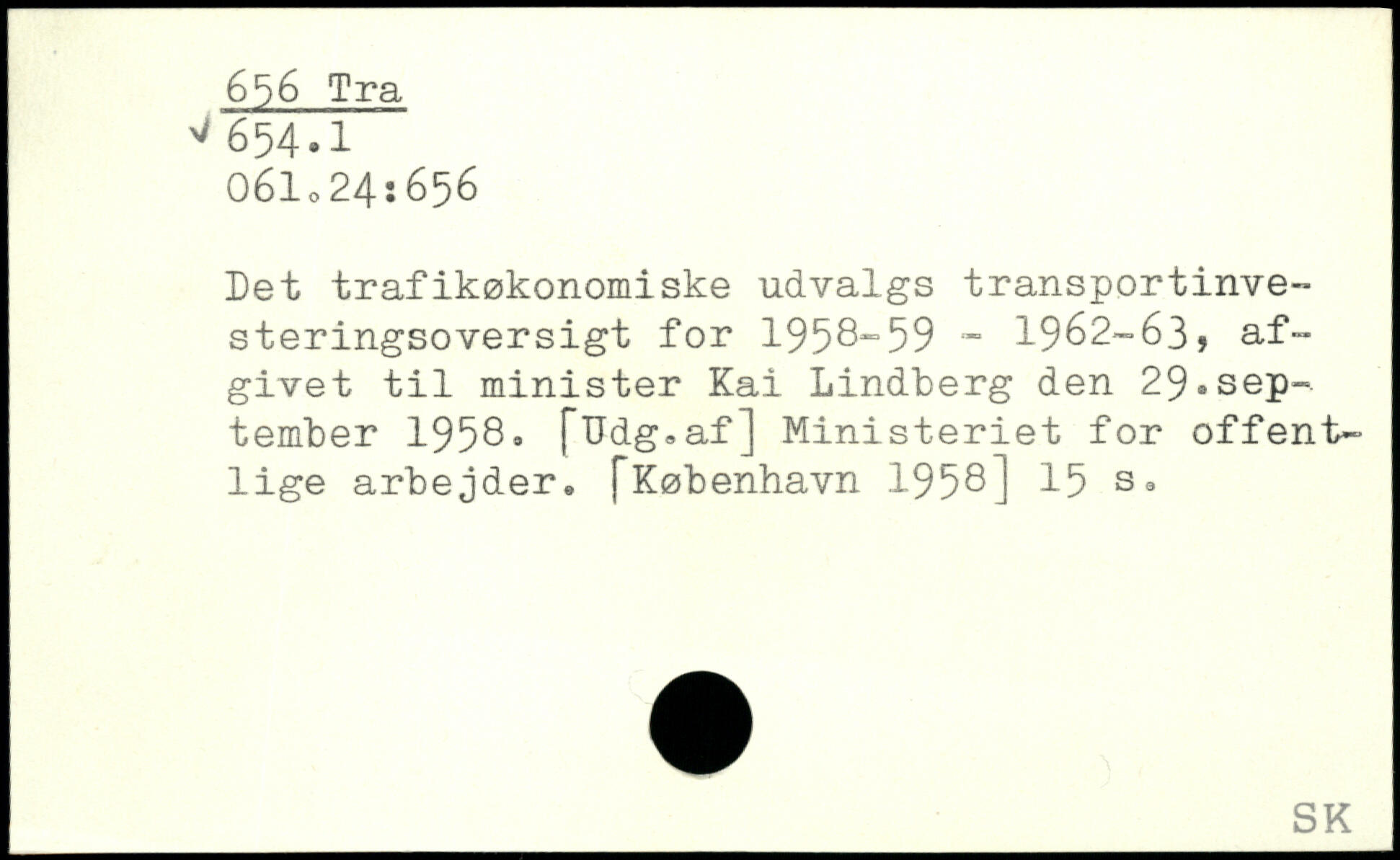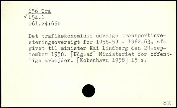 Det trafikøkonomiske udvalgs transportinvesteringsoversigt for 1958-59 - 1962-63, afgivet til minister Kai Lindberg den 29.september 1958. fUdg, af] Ministeriet for offentlige arbejder
