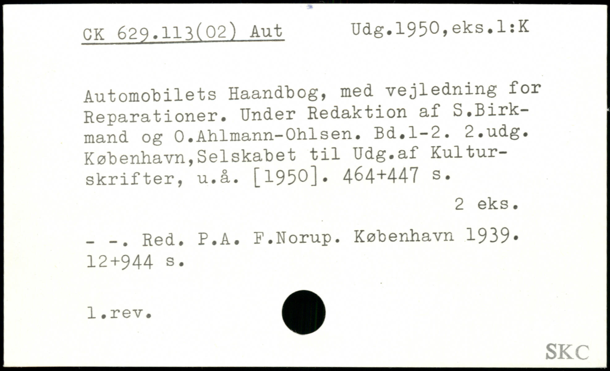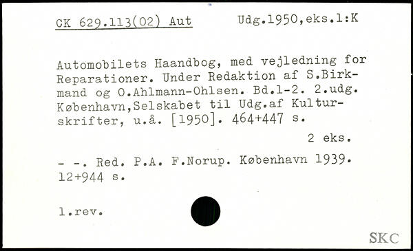 Automobilets Haandbog, med vejledning for Reparationer. Under Redaktion af S.Birk-mand og 0.Ahlmann-Ohlsen.