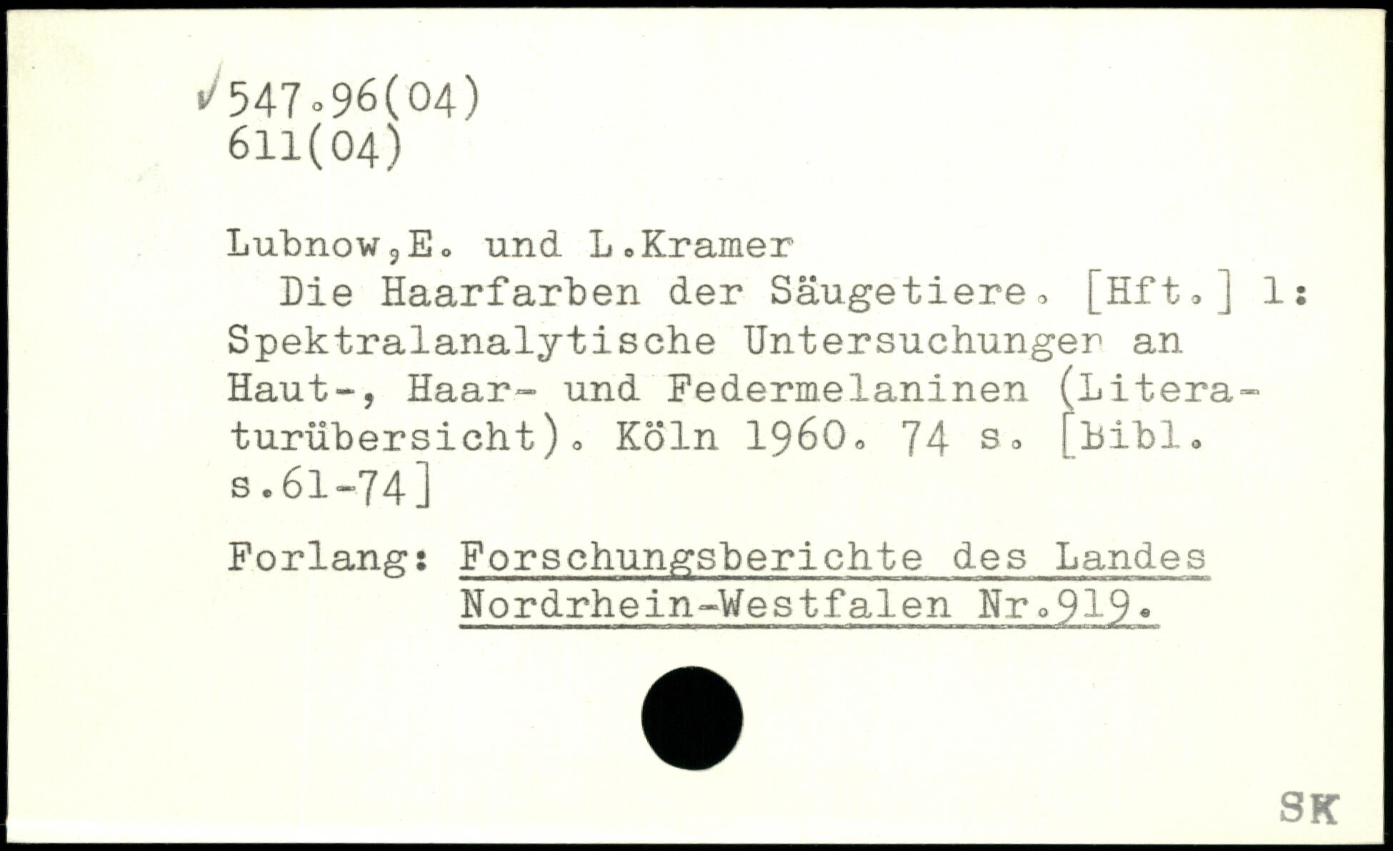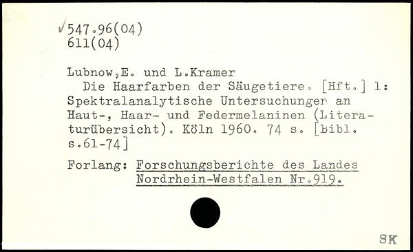 Lubnow?E, und L,Kramer Die Haarfarben der Säugetiere, [Hft.] 1: Spektralanalytische Untersuchunger an Haut-, Haar- und Federmelaninen (Literaturübersicht)