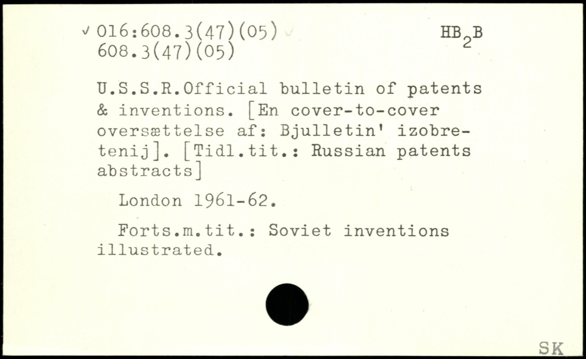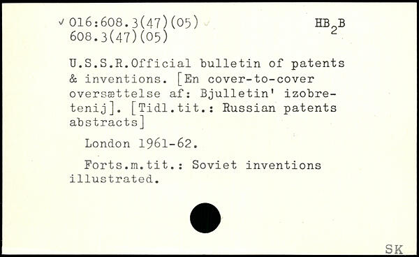 U.S.S.R.Official bulletin of patents & inventions. [En cover-to-cover oversættelse af: Bjulletin' izobre-tenij], [Tidl.tit.: Russian patents abstracts]