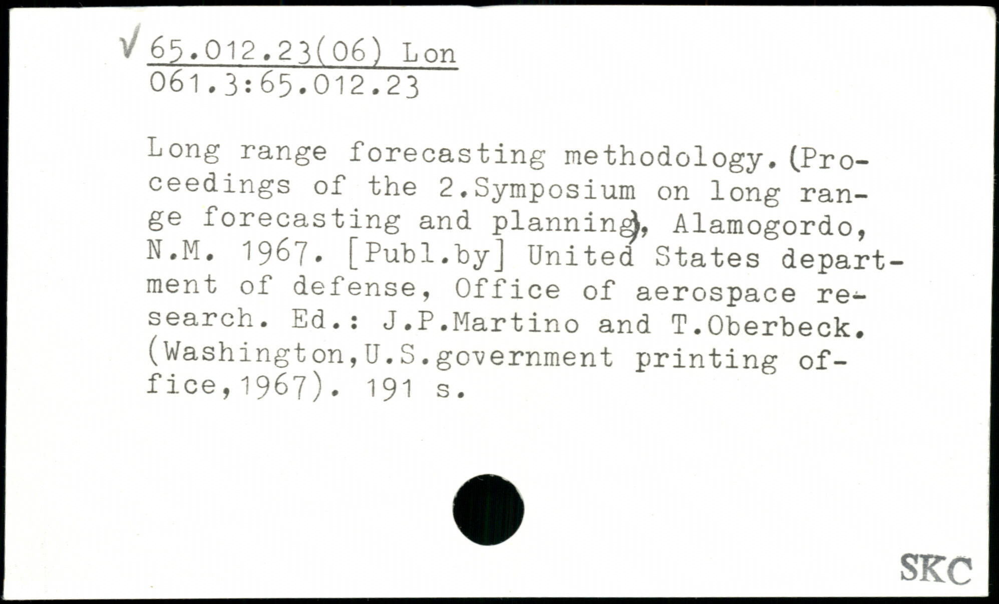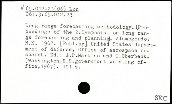 Long range forecasting methodology. (Proceedings of the 2.Symposium on long range forecasting and planning, Alamogordo, N.M. 1967. [Publ.hy] United States department of defense, Office of aerospace research. Ed.: J.P.Martino and T.Oberbeck. (Washington,U.S.government printing office, 1967).
