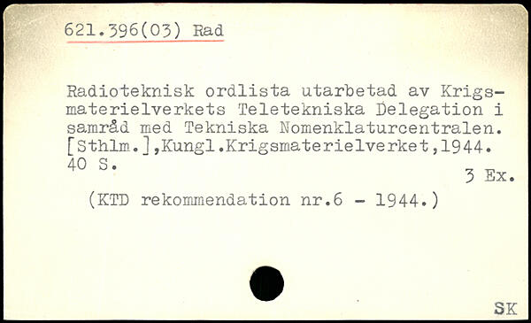 Radioteknisk ordlista utarbetad av Krigs-mate rielve rket s Teletekniska Delegation i samråd med Tekniska Nomenklaturcentralen.