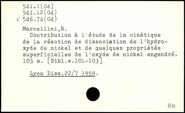Marcellini jRo Contribution à 1!étude de la cinétique de la réaction de dissociation de 1’hydroxy de de nickel et de quelques propriétés superficielles de l’oxyde de nickel engendré