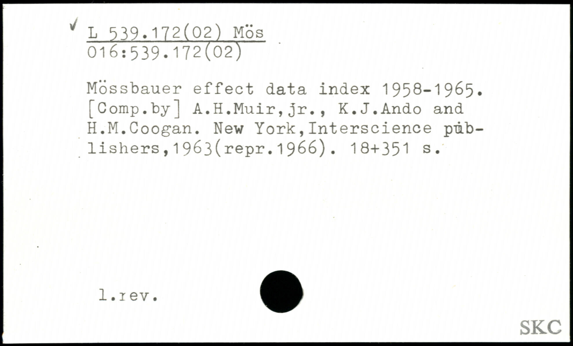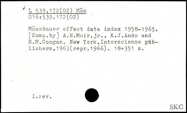 Mossbauer effect data index 1958-1965. [Comp.by] A.H.Muir,Jr., K.J.Ando and H.M.Coogan. New York,Interscience publishers ,19b3(repr.1966).
