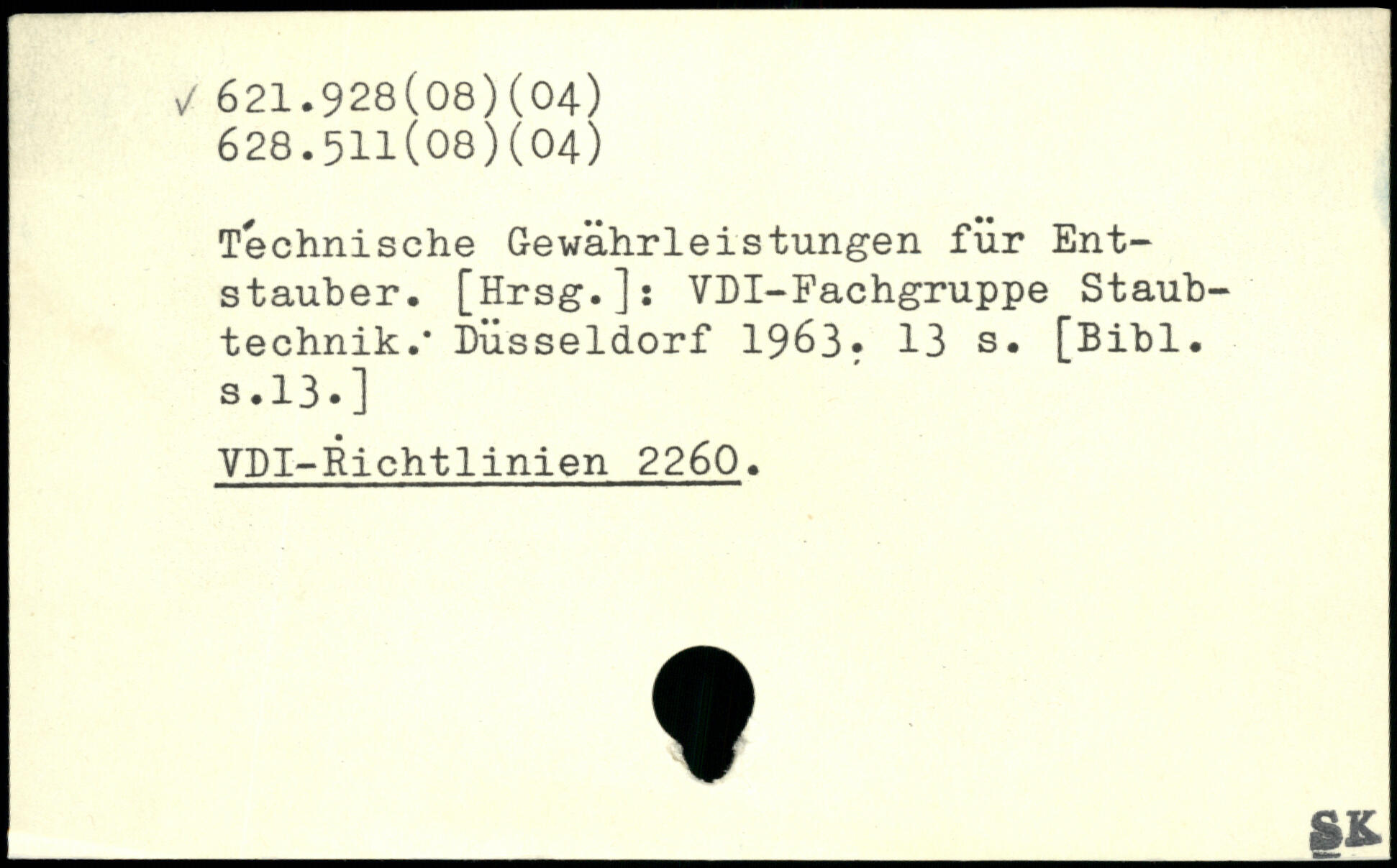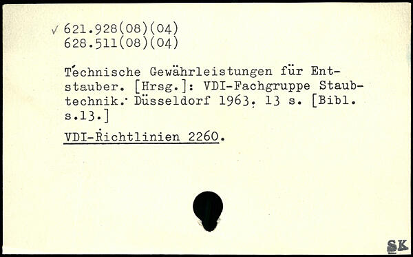 Technische Gewährleistungen für Entstauber. [Hrsg.]: VDI-Fachgruppe Staubtechnik.. Düsseldorf 1963