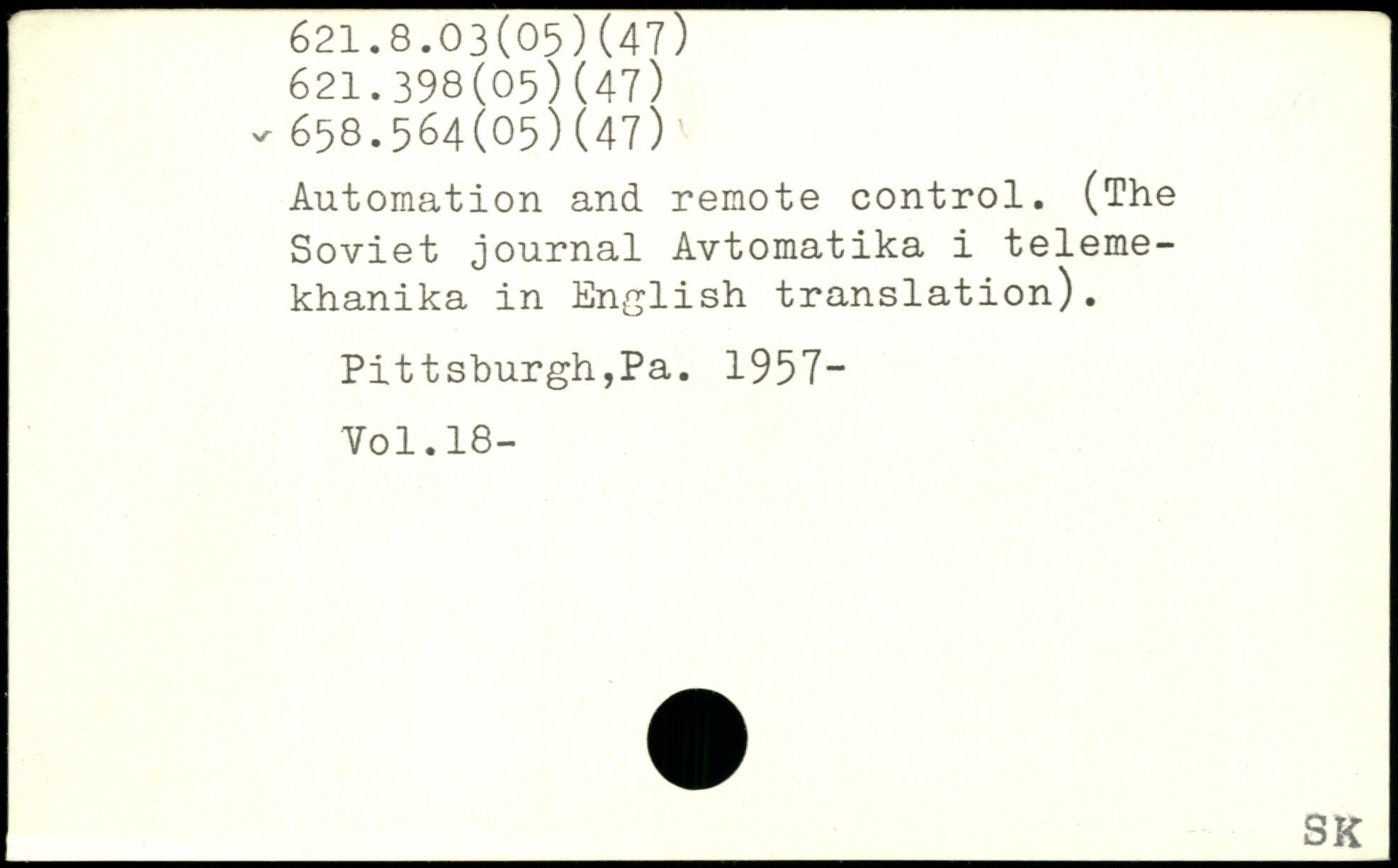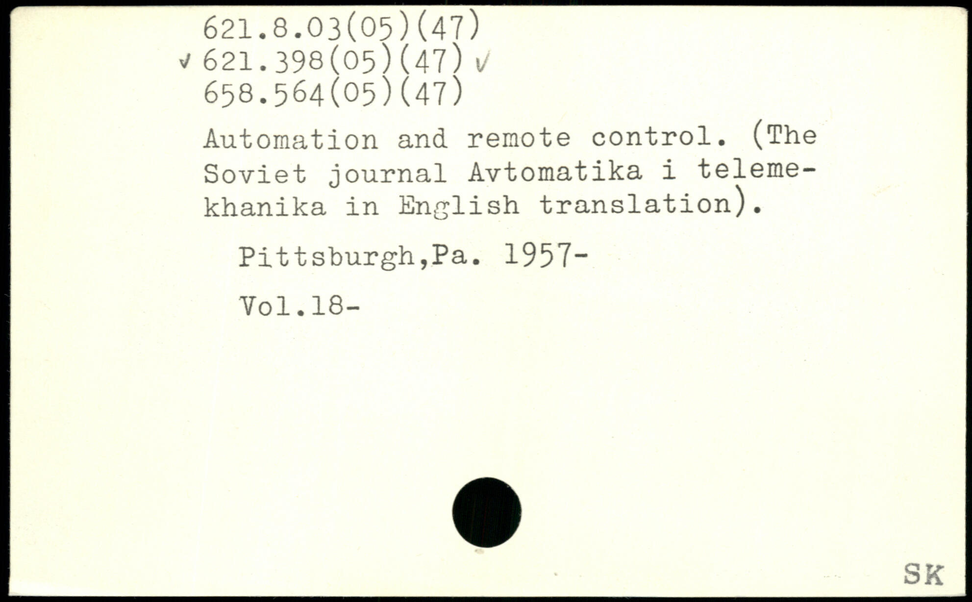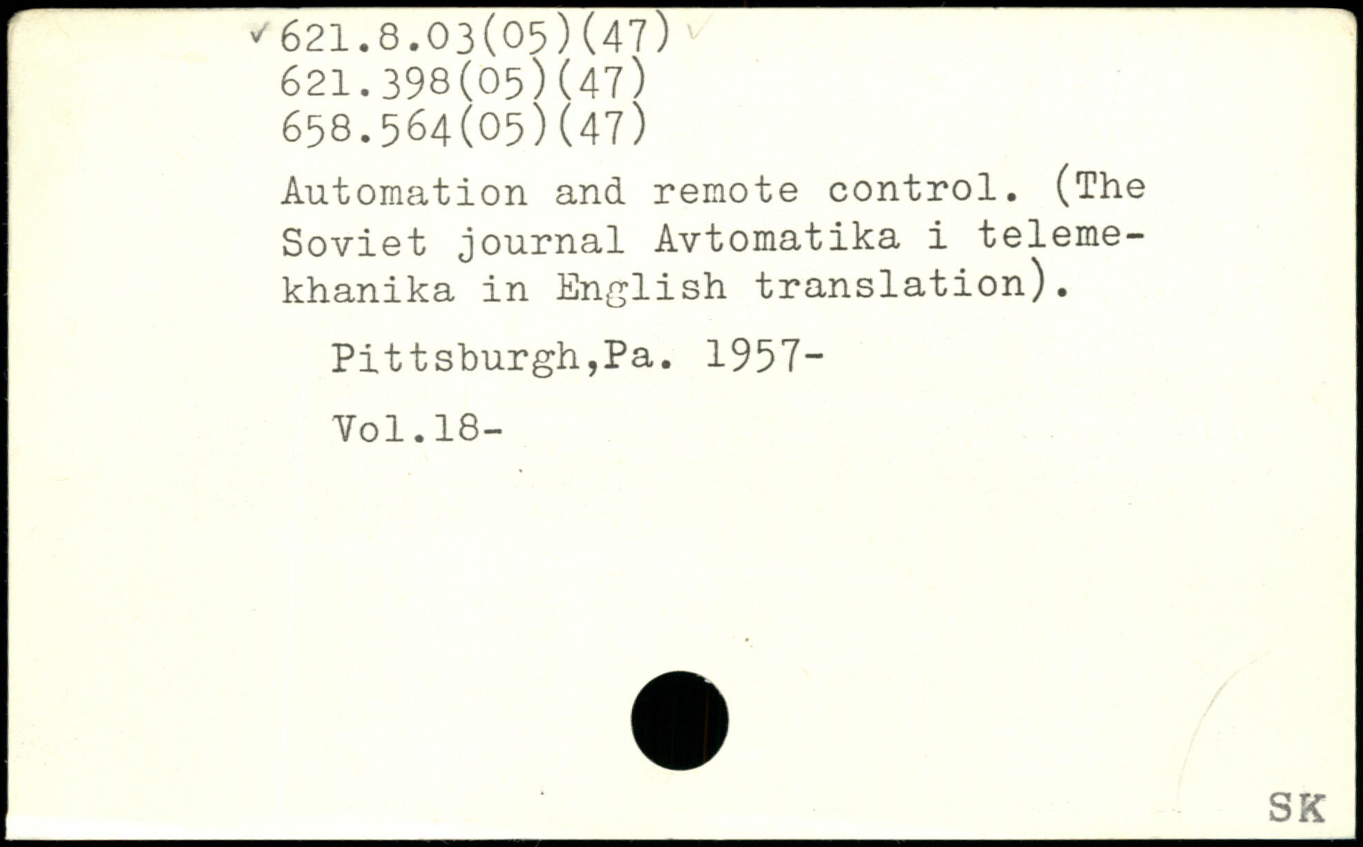 Automation and remote control. (The Soviet journal Avtomatika i teleme-khanika in English translation). Pittsburgh,Pa. 1957-