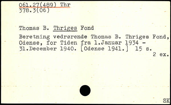 Thomas B. Thriges Pond Beretning vedrørende Thomas B. Thriges Pond, Odense, for Tiden fra 1.Januar 1934 -31,December 1940. [Odense 1941.]