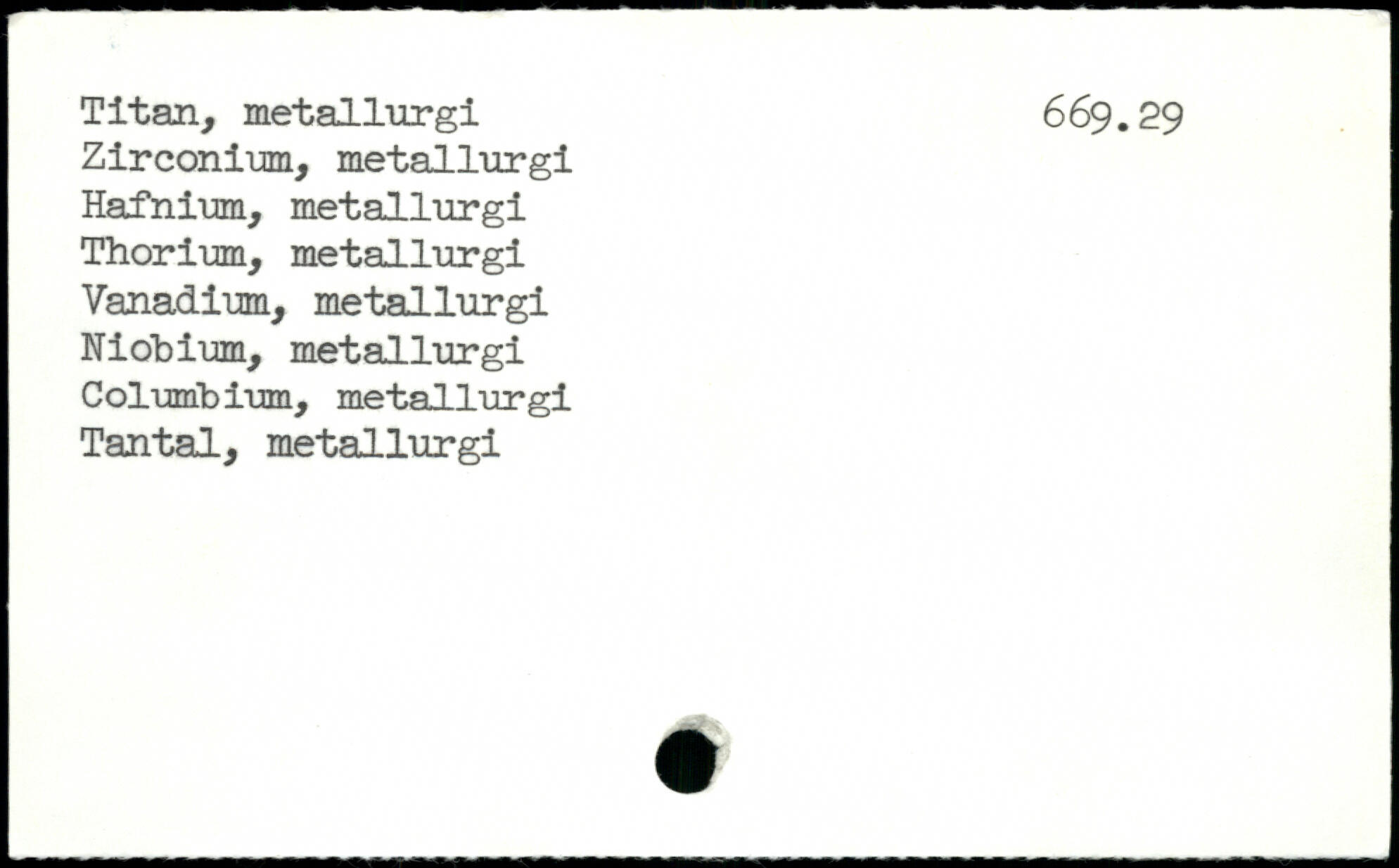 Titan, metallurgi 669.29 Zirconium, metallurgi Hafnium, metallurgi Thorium, metallurgi Vanadium, metallurgi Niobium, metallurgi Columbium, metallurgi Tantal, metallurgi