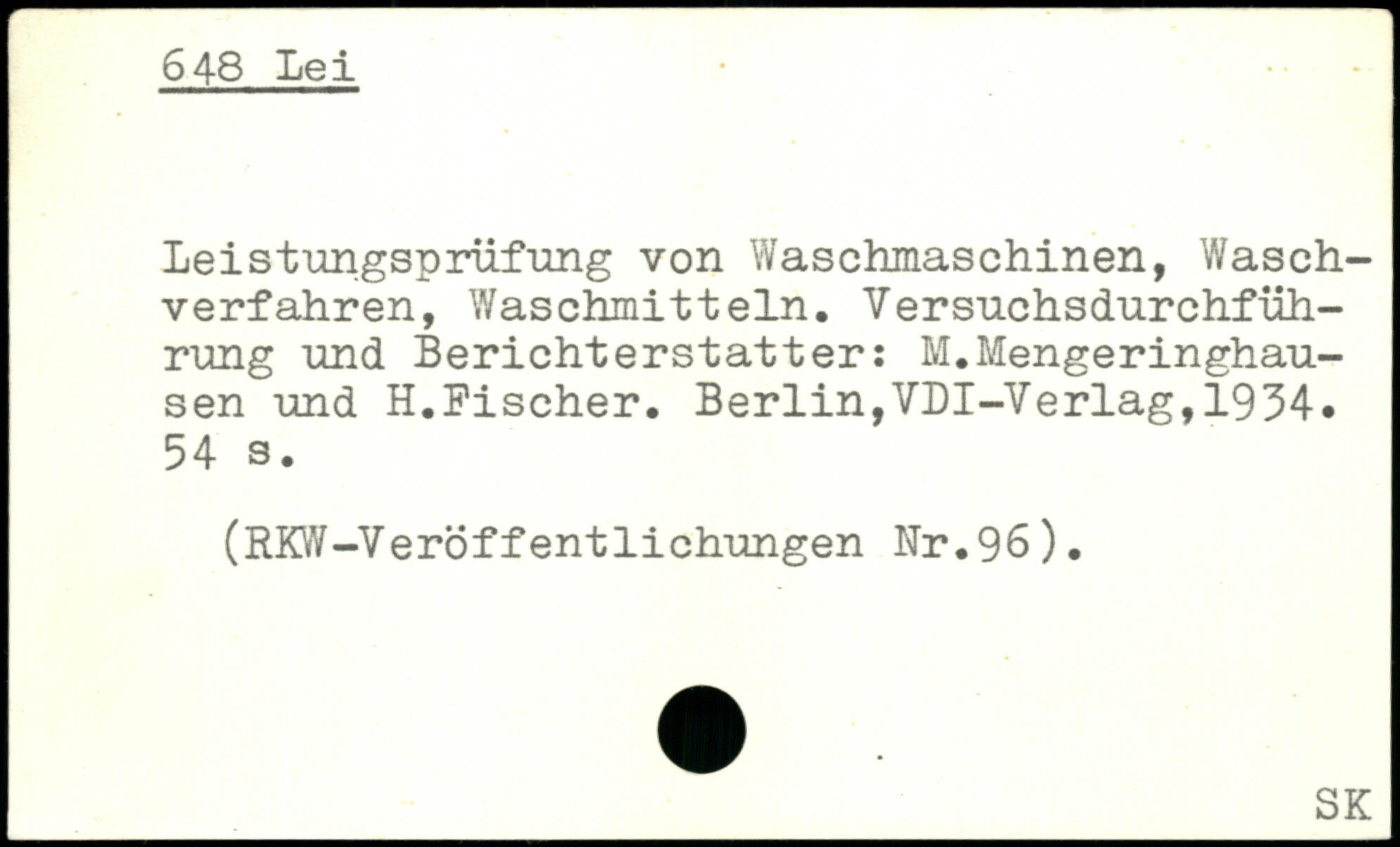 Leistungsprüfung von Waschmaschinen, Waschverfahren, Waschmitteln, Versuchsdurchfüh-rung und Berichterstatter: M.Mengeringhausen und H.Fischer.